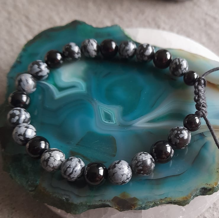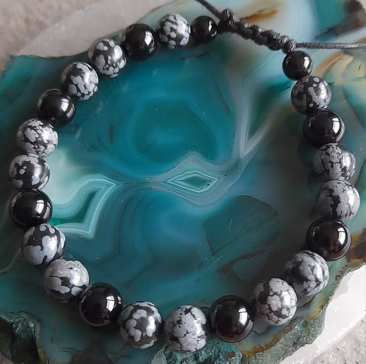 Snowflake obsidian and black onyx are knotted on black waxed cotton cord .