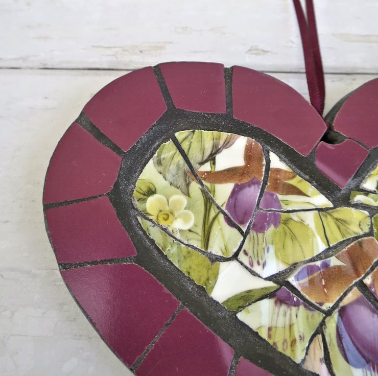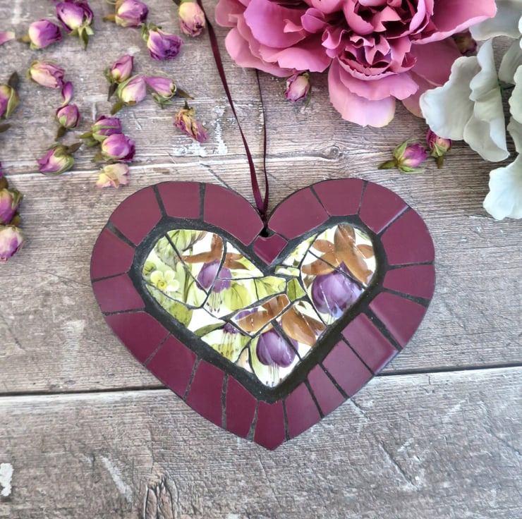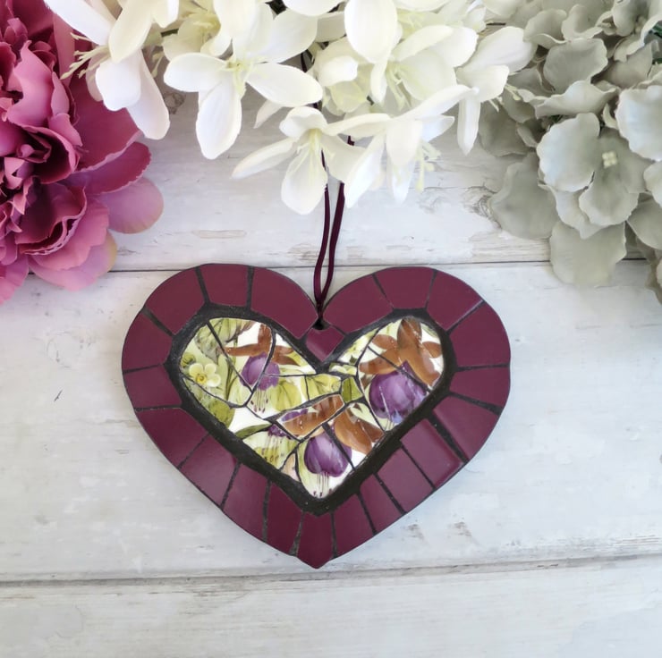 This handmade mosaic heart is created using beautiful fragments of vintage china from the classic Fuchsia pattern by Windsor—rich in purples, greens and delicate florals. Each piece has been thoughtfully arranged by hand to form a one-of-a-kind wall hanging that feels both nostalgic and timeless.