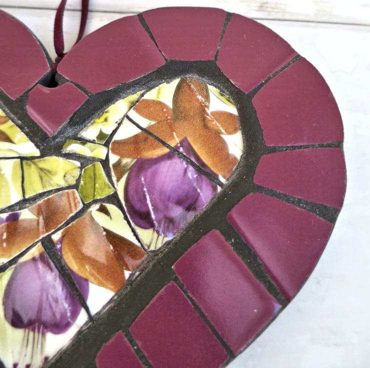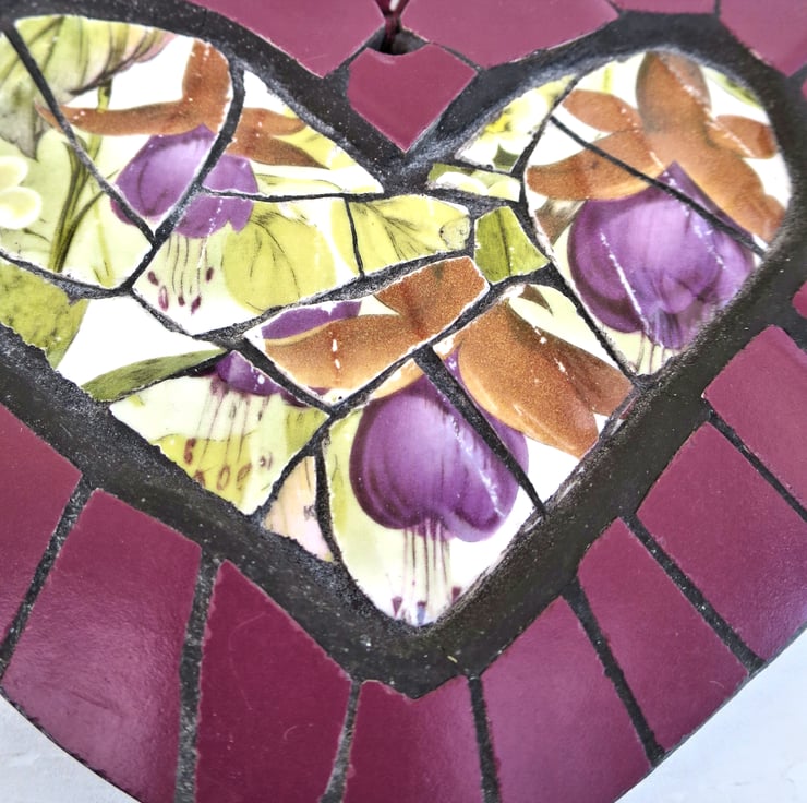 Fuchsia Flower Mosaic Heart, Handmade Wall Art with Vintage China