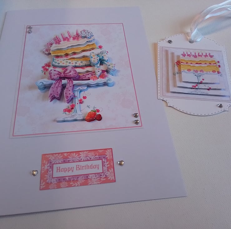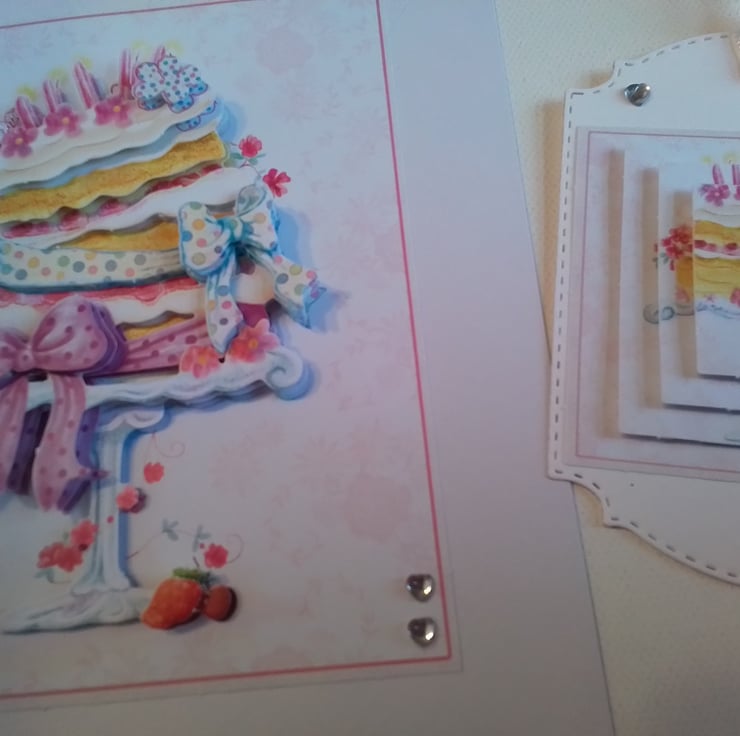 A lovely decoupage Birthday cake card which has been made by layering images on top of each other to create this beautiful card.