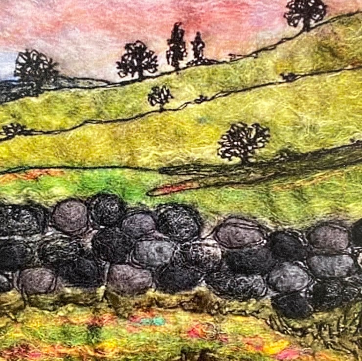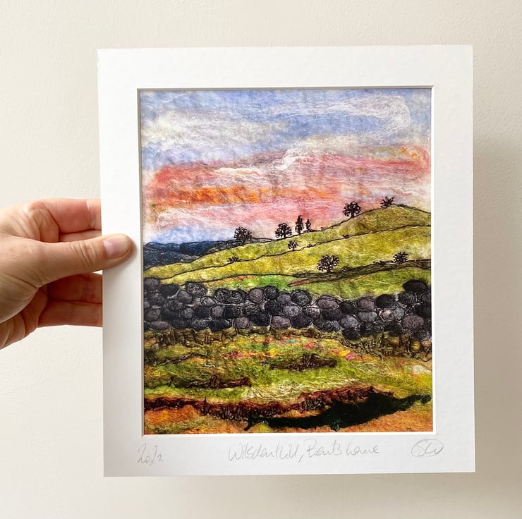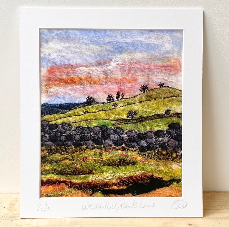 This charming art piece is a print of one of my wet felted images of my village. The sun is setting over a Wilsden Hill, viewed across fields and a dry stone wall.