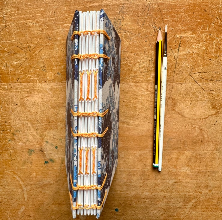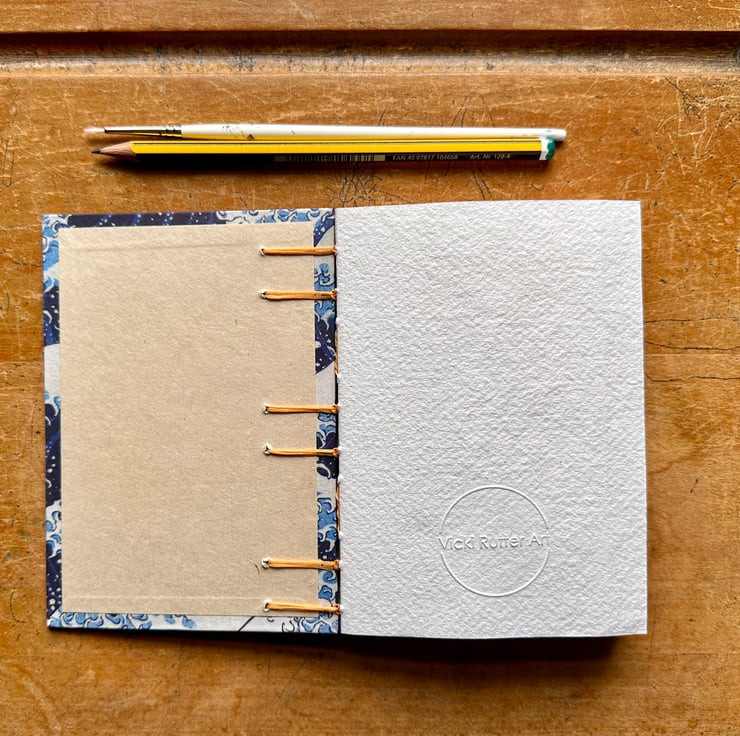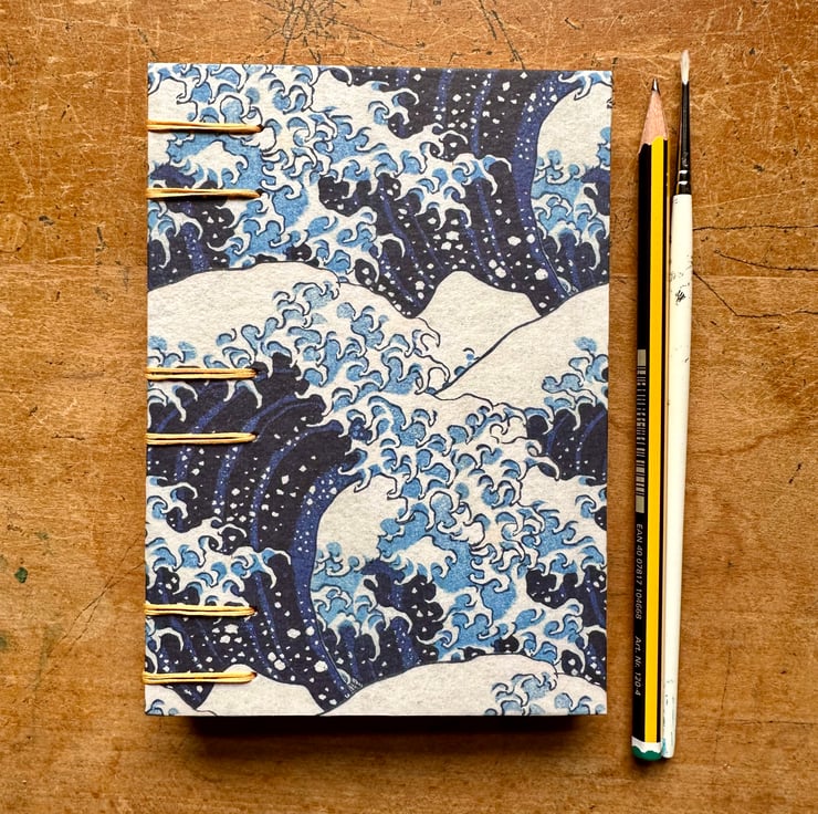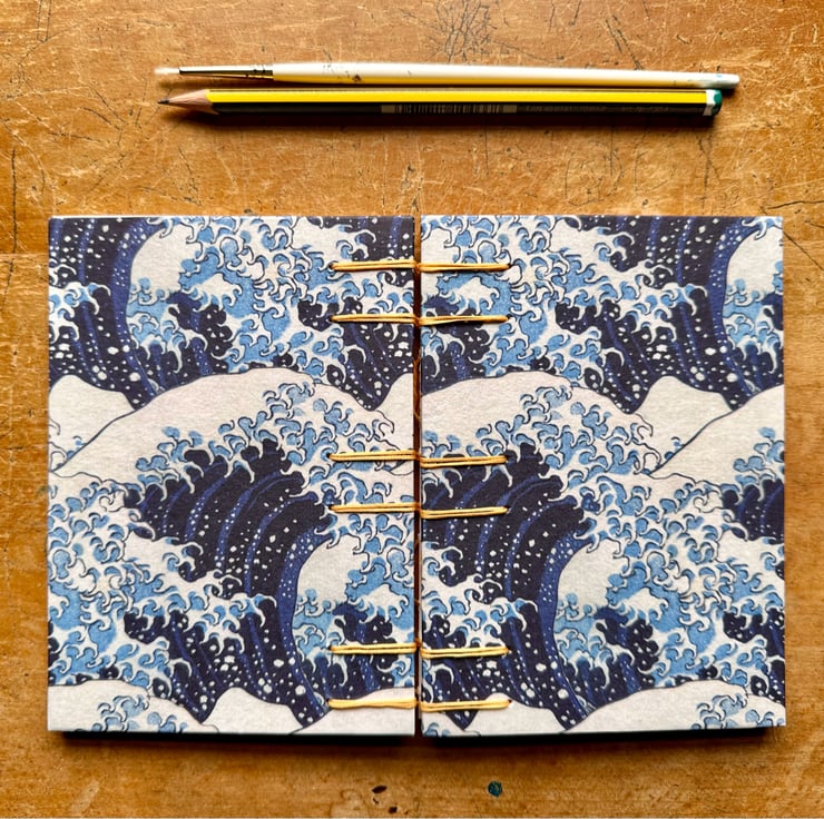 This is a lovely 36 page A6 sketchbook. It has been bound using Coptic stitching which is both beautiful and strong. It allows the pages to lay flat when the book is open, perfect for sketching and writing. Covered using paper depicting Hokusai’s great wave, one of my favourite pieces of art