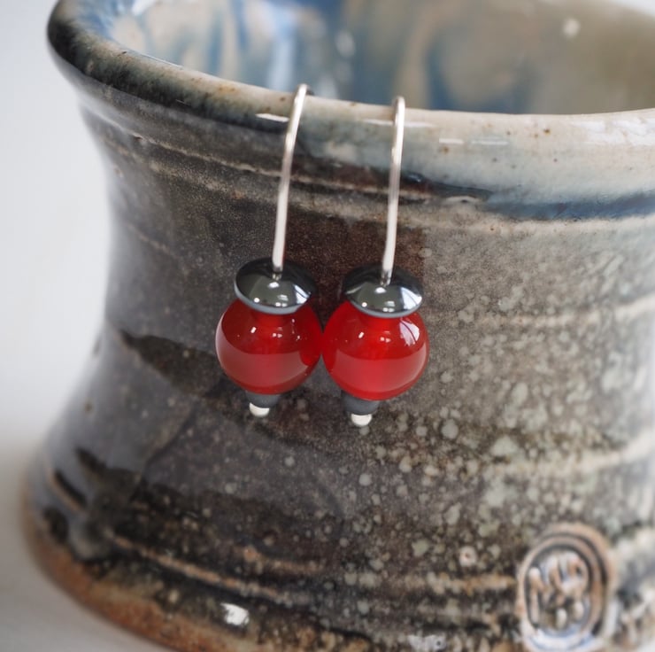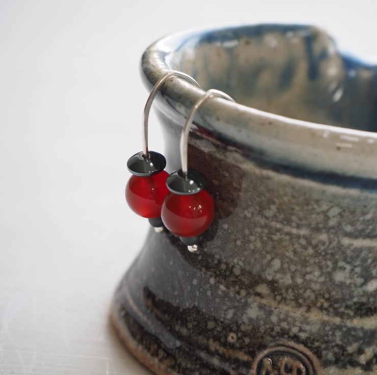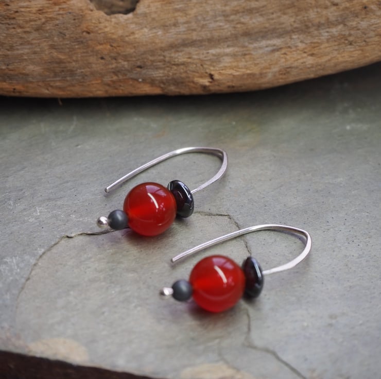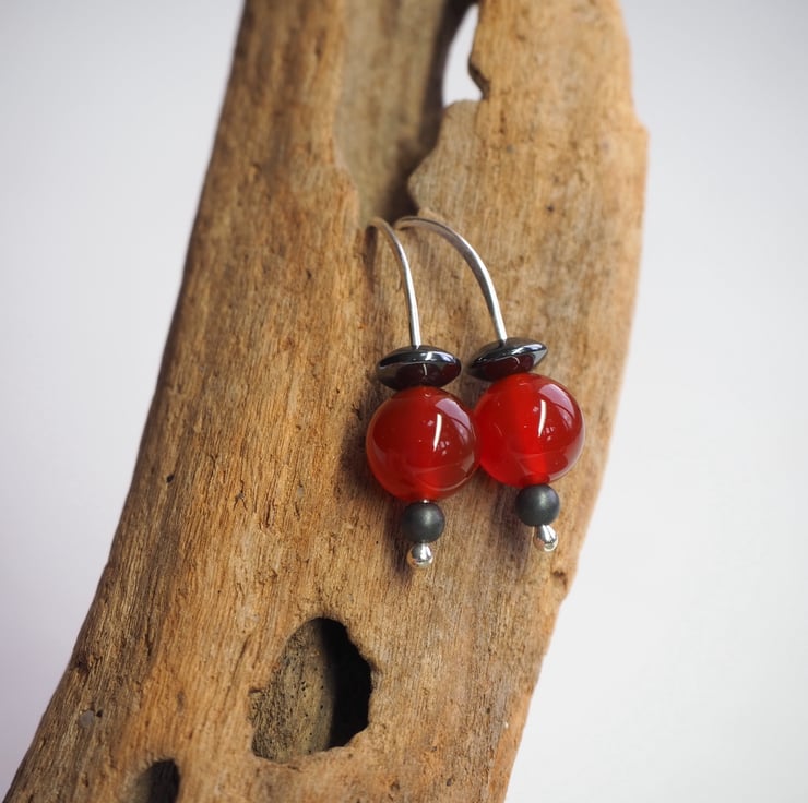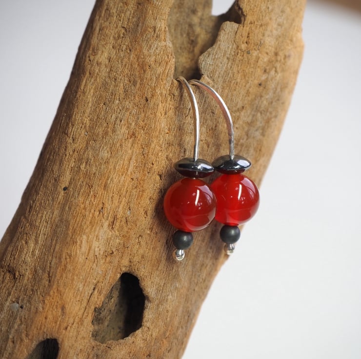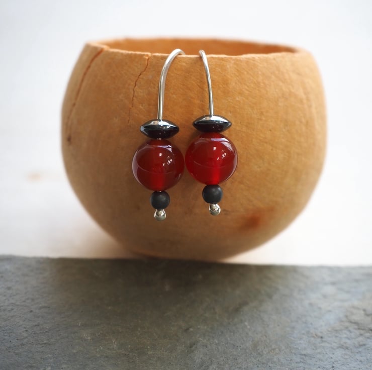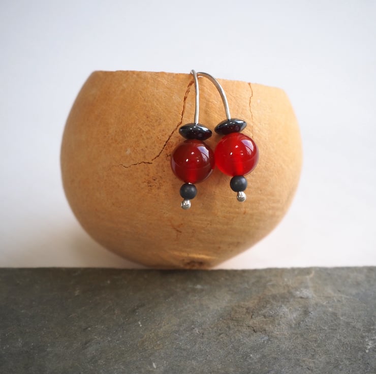 Beautiful berry red coloured carnelian beads have been teamed up with hematite beads to make these simple drop earrings.