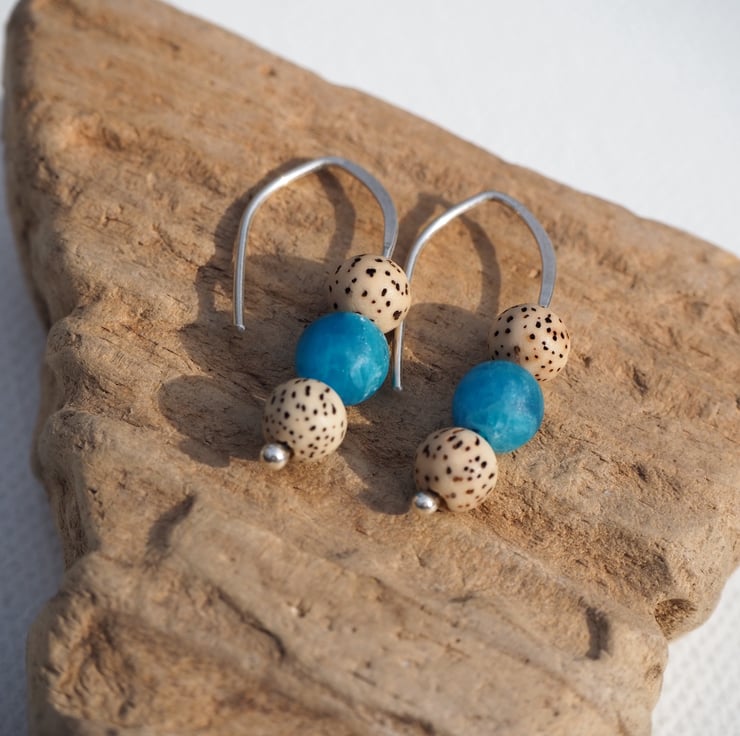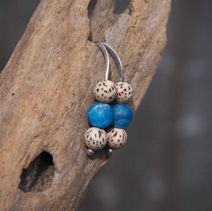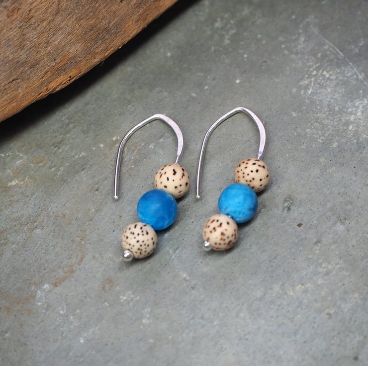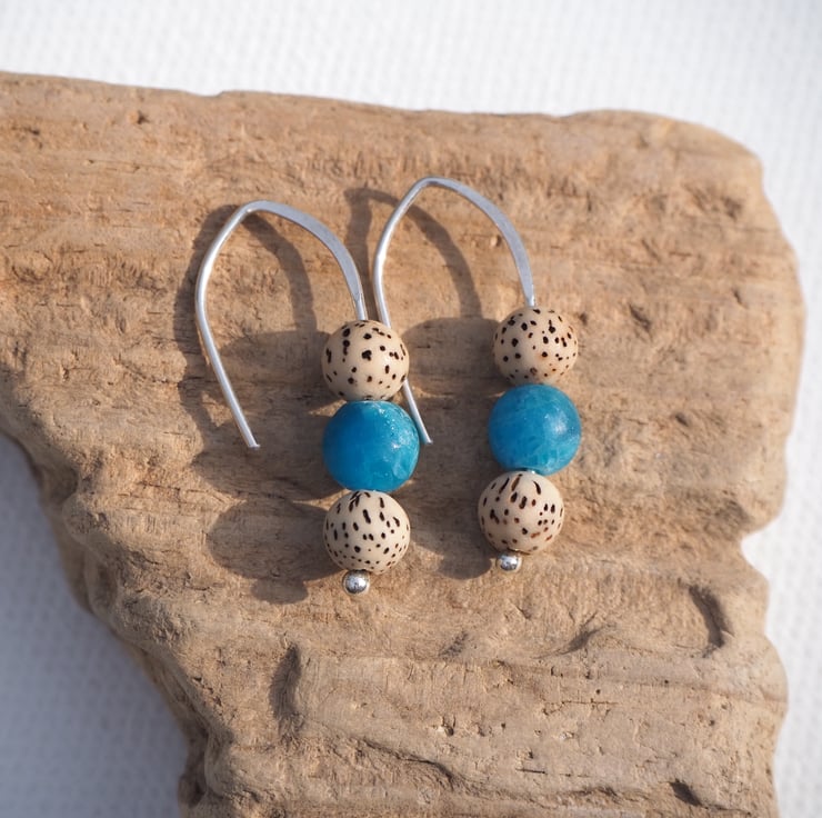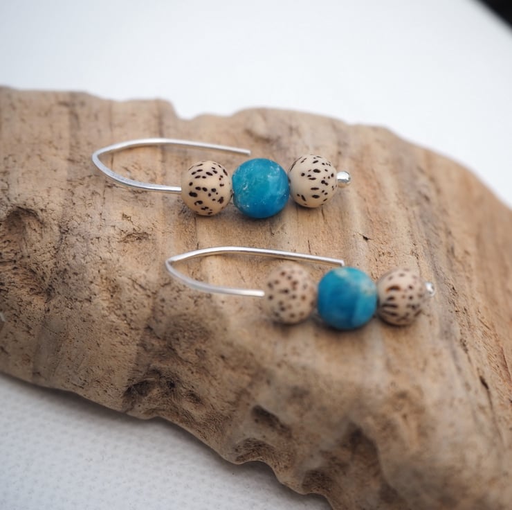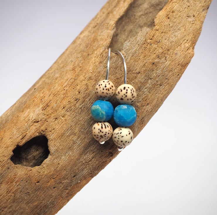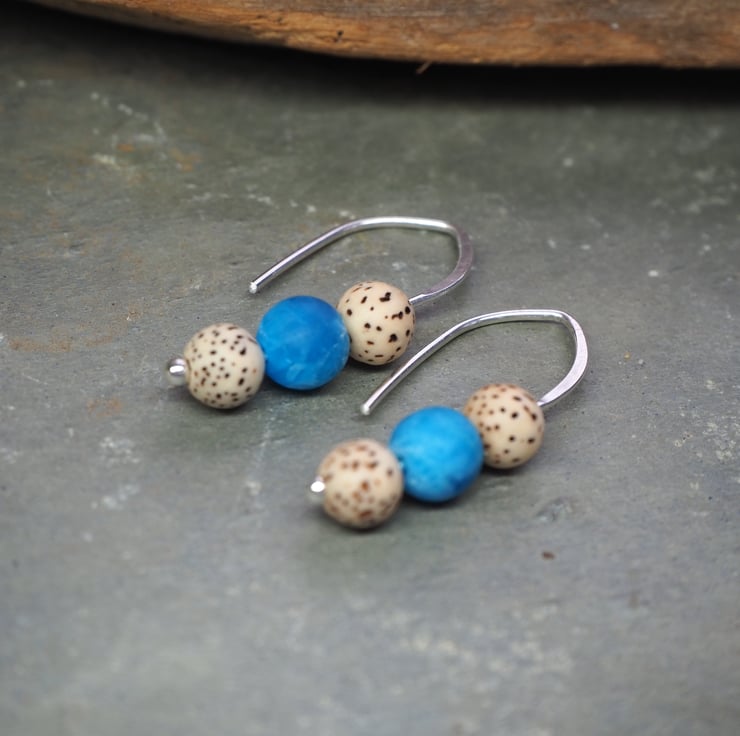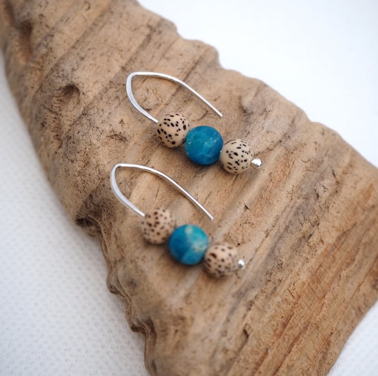 Genuine Lotus seed beads (also known as Bodhi beads) have been teamed up with beautiful turquoise coloured frosted Apatite beads to make these simple drop earrings.