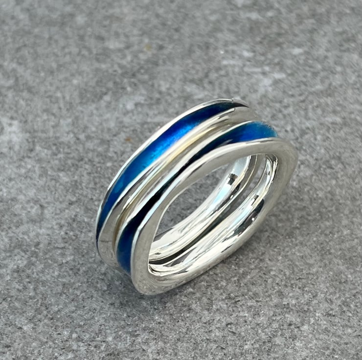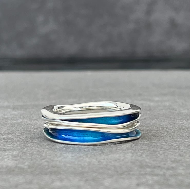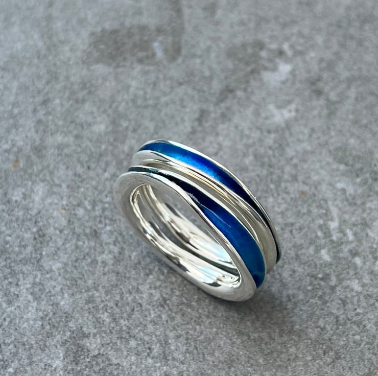 This Enamel Stack Ring has been handcrafted by Michelle from Sterling Silver and blue enamels. The two freeform rings sit together and the widest width is approximately: 8.5mm . If you would also like some deep turquoise in the ring please. along with your size, leave me a message at Checkout.