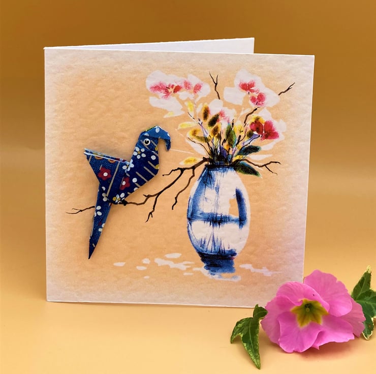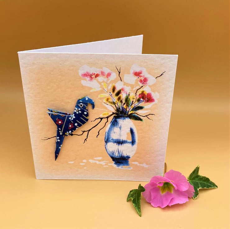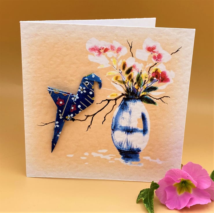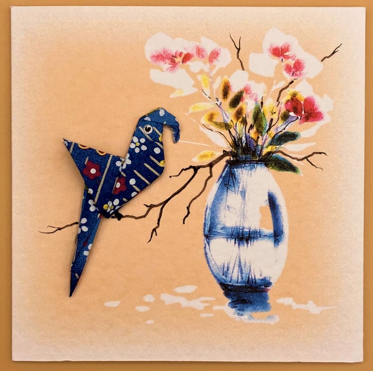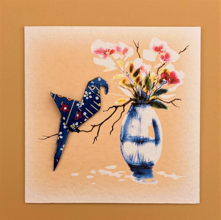 This blank Greetings Card shows a hand folded dark blue Origami Parrot firmly attached to a pretty floral card. The background print design is taken from one of my original watercolour paintings and enhanced with hand drawn detail. I make the origami parrots from carefully chosen Japanese paper so no two parrots are ever the same, this parrot's in dark blue, making the card a 'one of a kind original'. These unique cards take time to make but they're perfect for special occasions.