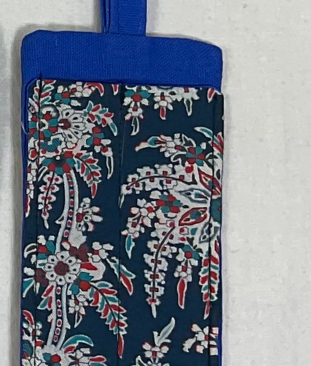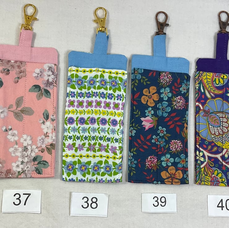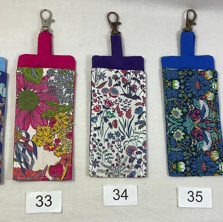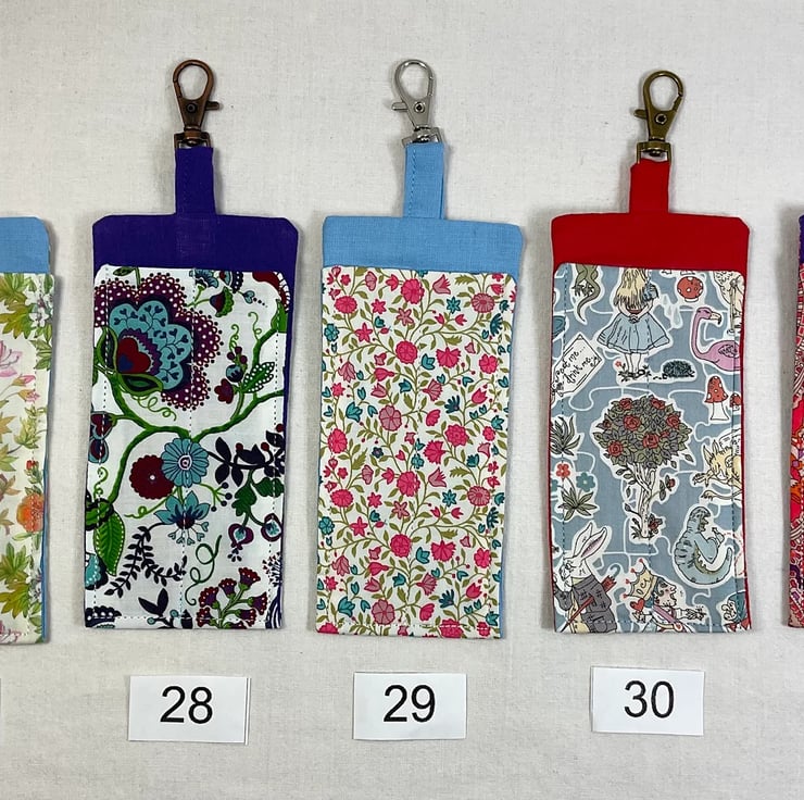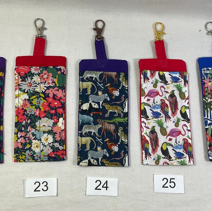 The little cases are made in cotton fabrics and are interfaced for rigidity. The lanyard clip is attached by a fabric matched loop. Pattern placement may vary.