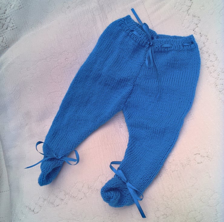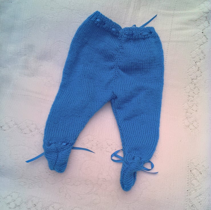 The baby's outfit is in stock in the gorgeous blue colour shown in a size to fit a 0 - 6 month old baby with a 16 inch chest or it can be made in the size and colour of your choice (most colours are available), please see below for sizes available and state colour required when you order. The processing time will be 1 - 2 weeks to produce and post to you.
