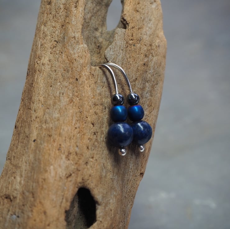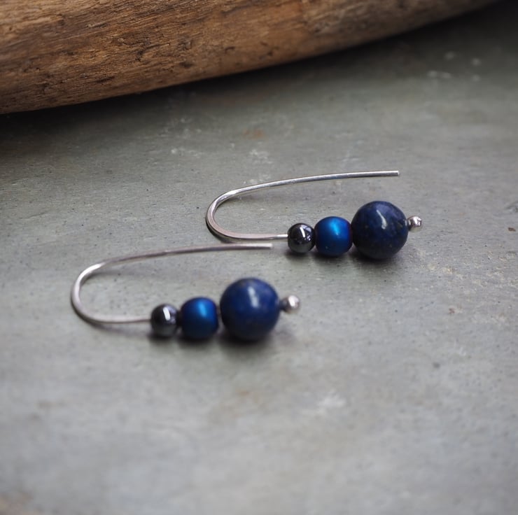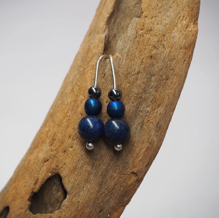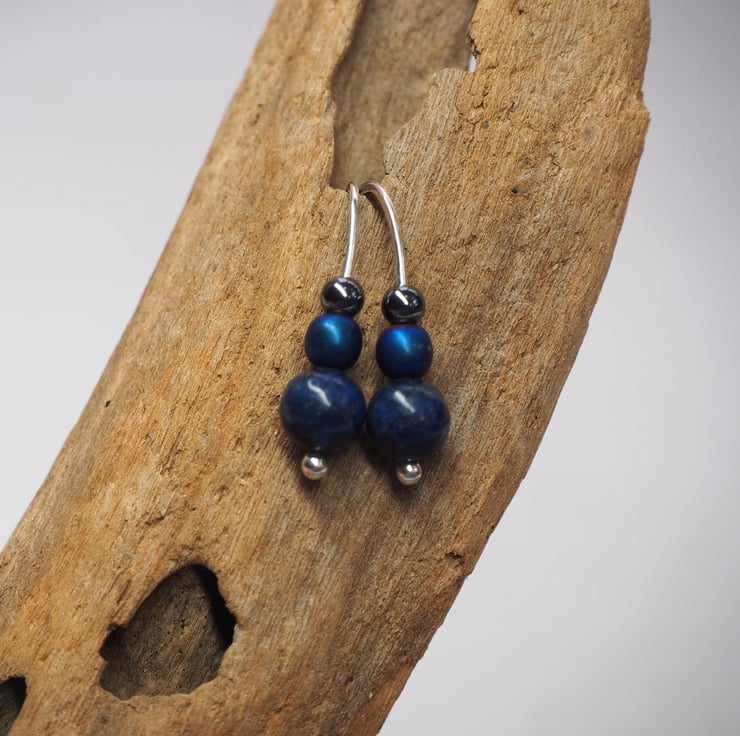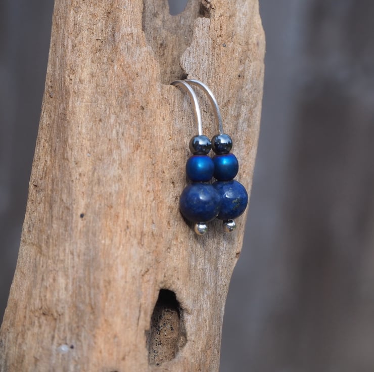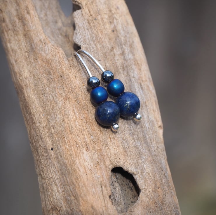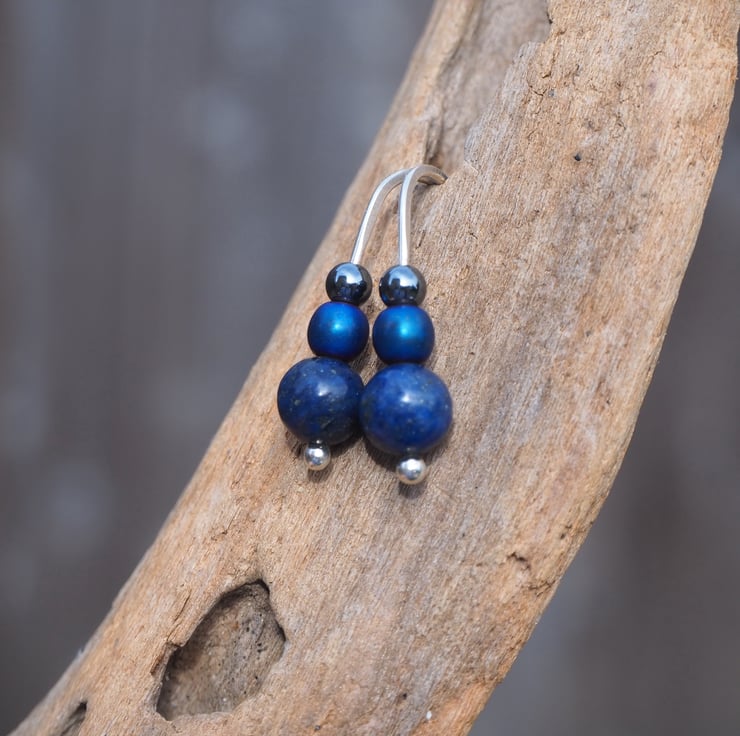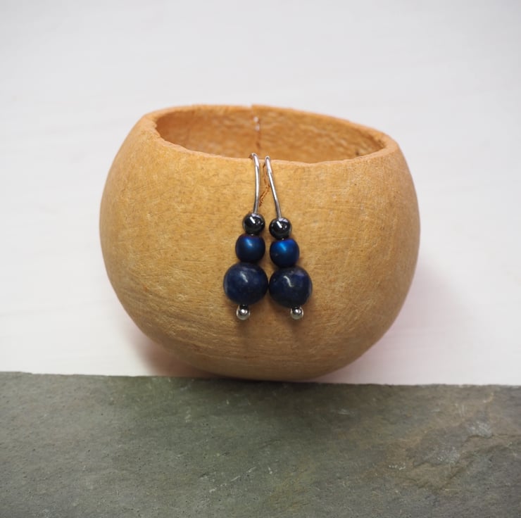 Very dark lapis lazuli beads have been teamed up with small frosted hematite and peacock hematite beads to make these simple drop earrings.