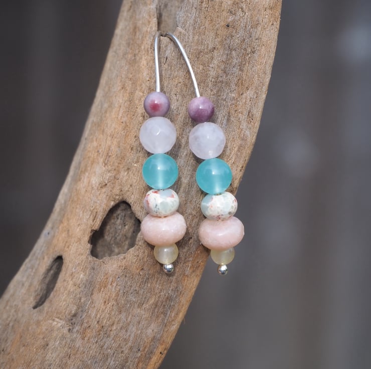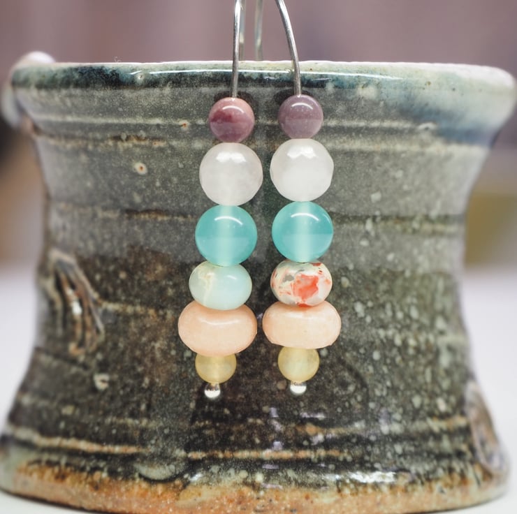 A mixture of beautiful pastel coloured beads have been put together to make these simple drop earrings. Long and elegant, these earrings make very pretty Spring/Summer jewellery.