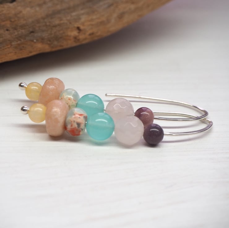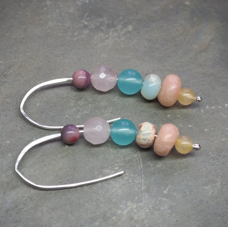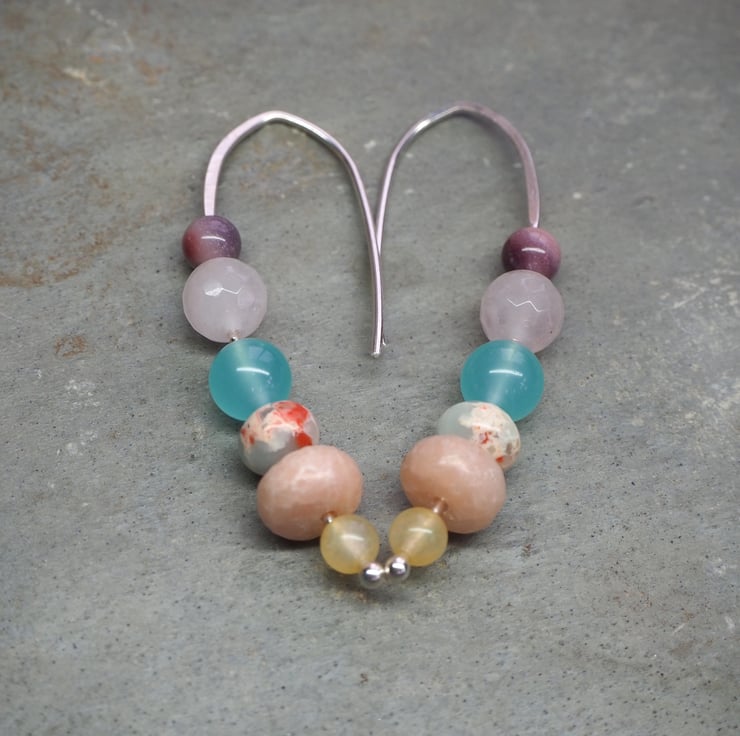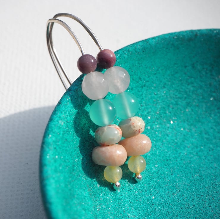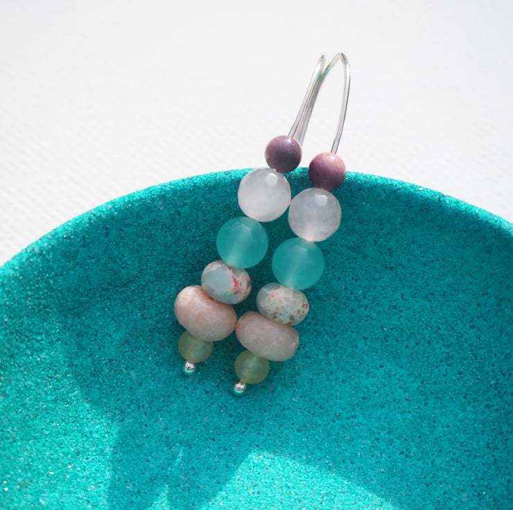 Beads are (from bottom) lemon jade, rose jade, impression jasper, duck egg blue glass, rose quartz, mookite.