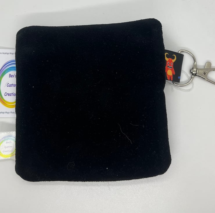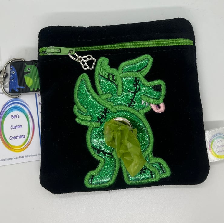 Handmade, embroidered small bag to fit a roll of poo bags, clips onto your dog’s harness, some leads or your belt strap. Bags dispenses through the hole place on the dogs bum.