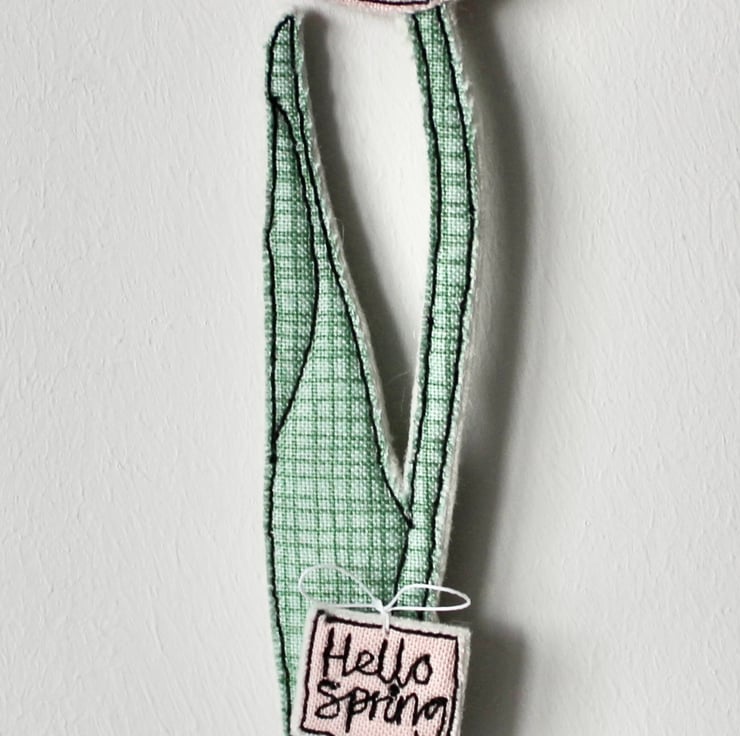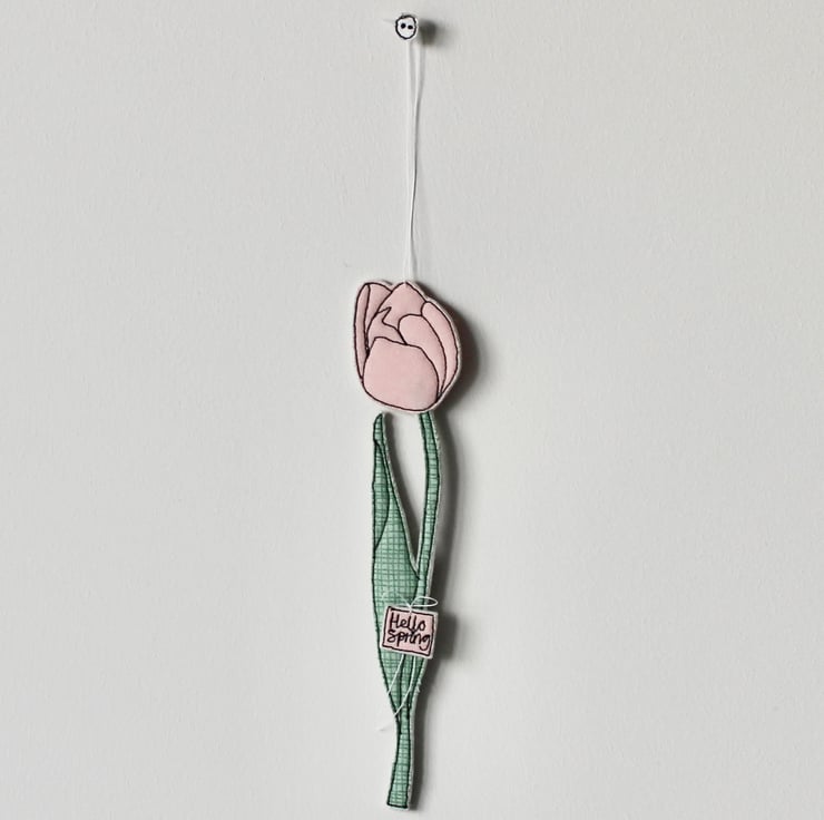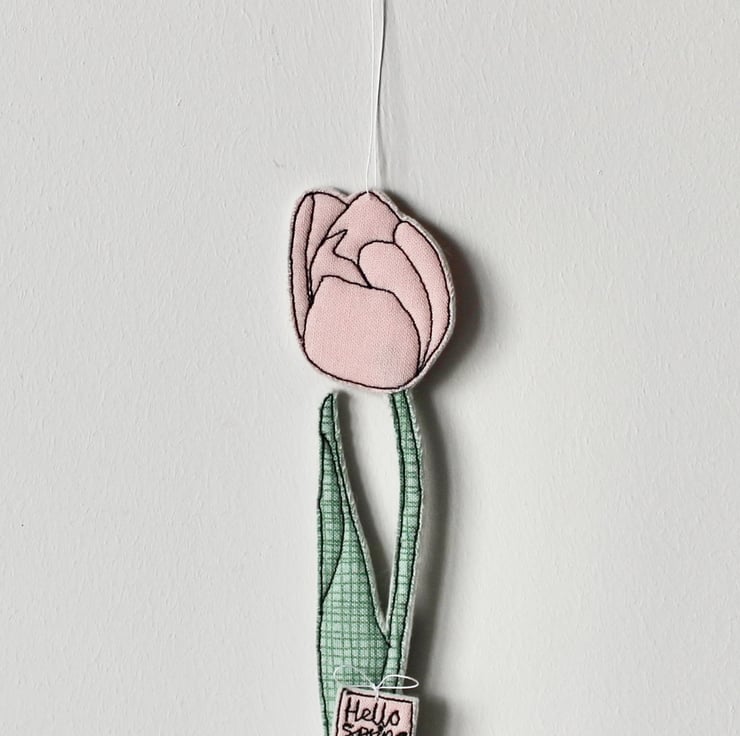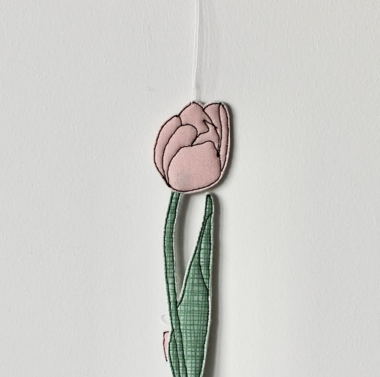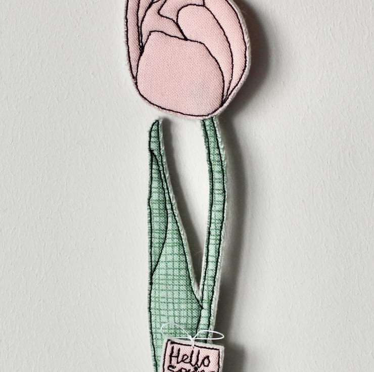 Tulips are created using freehand machine embroidery and multiple layers of cotton cloth and 100% wool felt. Cut out by hand using very sharp scissors with a linen thread to suspend.