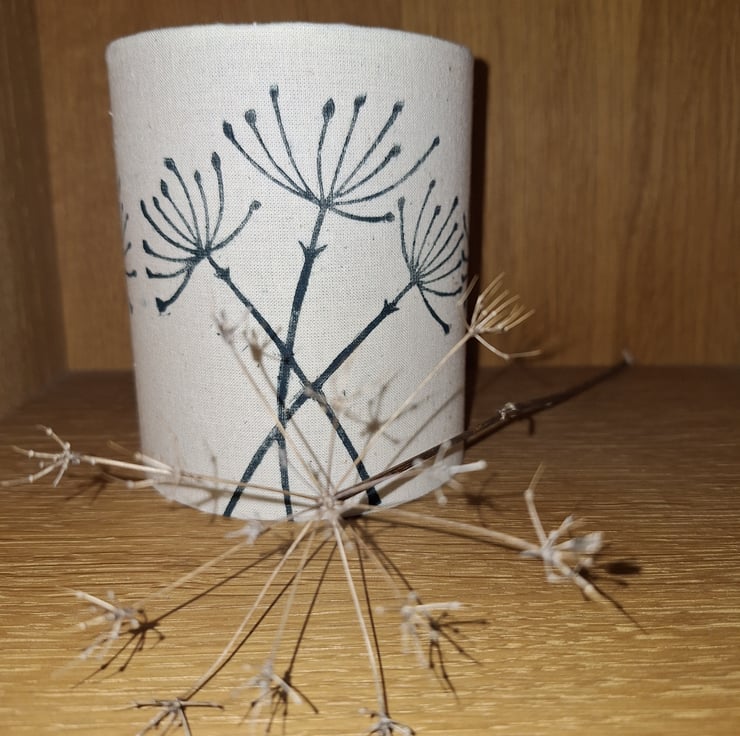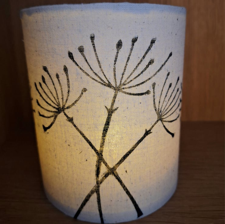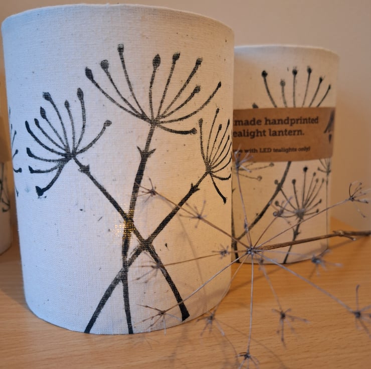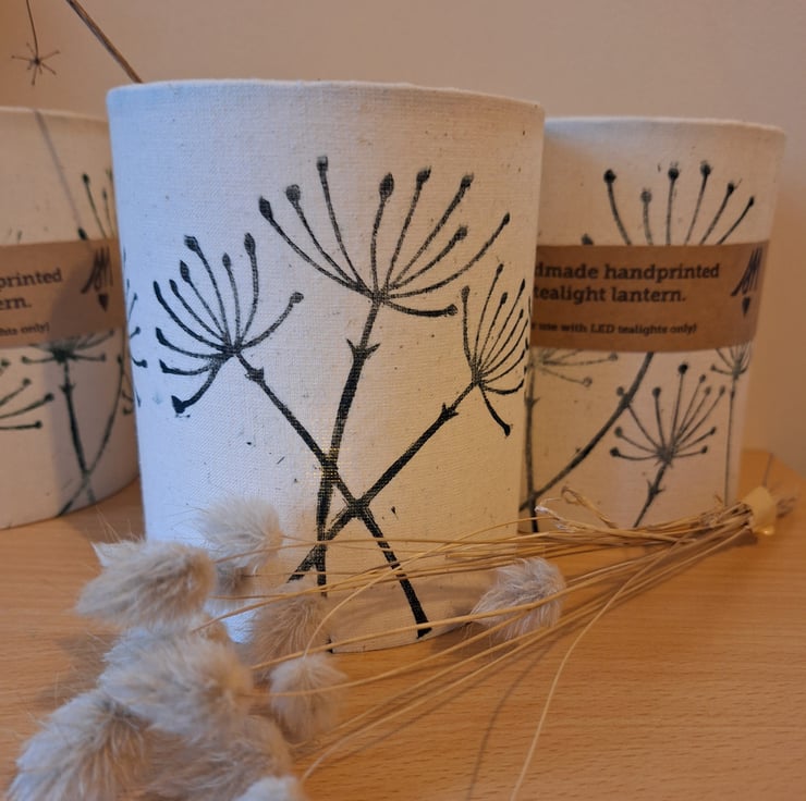 This botanical handmade LED tealight lantern has a linoprinted cow parsley design printed in very dark green/black fabric ink around the off-white 100% cotton fabric. It is supplied with a soft white flickering LED tealight which gives a cosy soft glow. The design is based on some of my favourite wild plants found in the nearby fields and hedgerows and has been designed and linoprinted onto the fabric by myself.