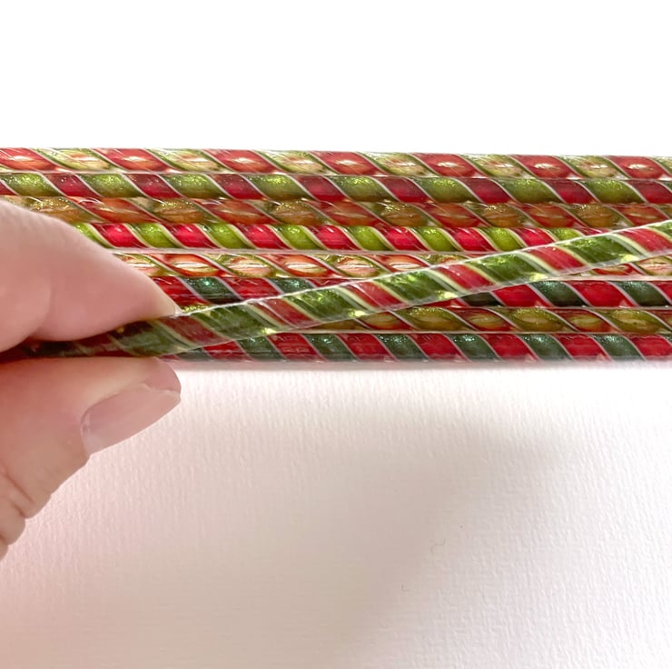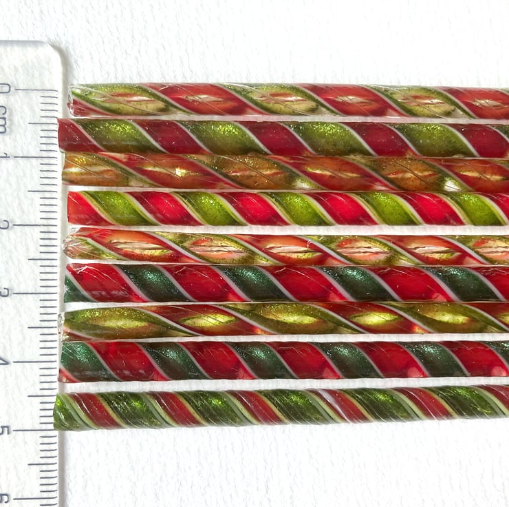 This pack includes nine glass rods with twisty patterns in a red, white and sparkly aventurine green.
