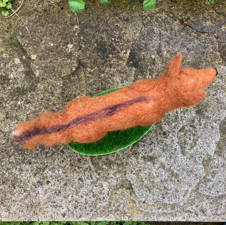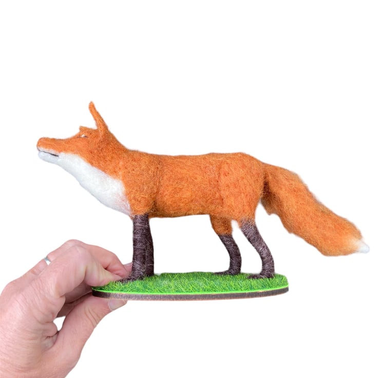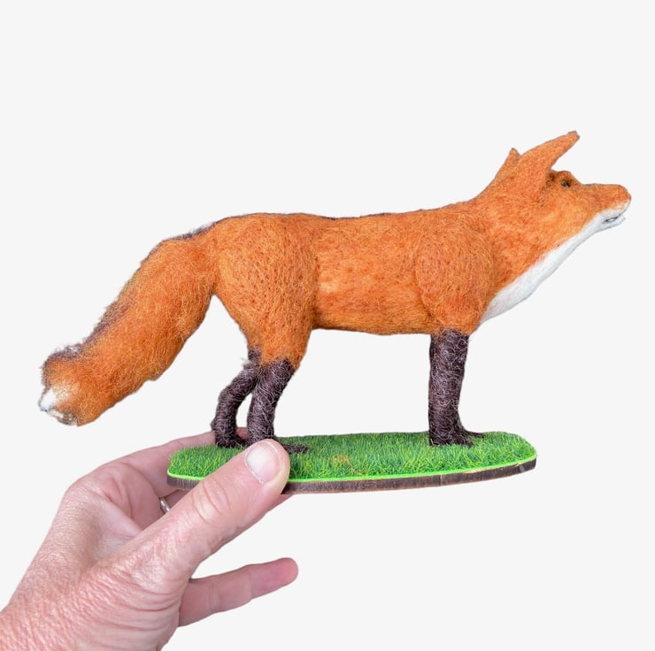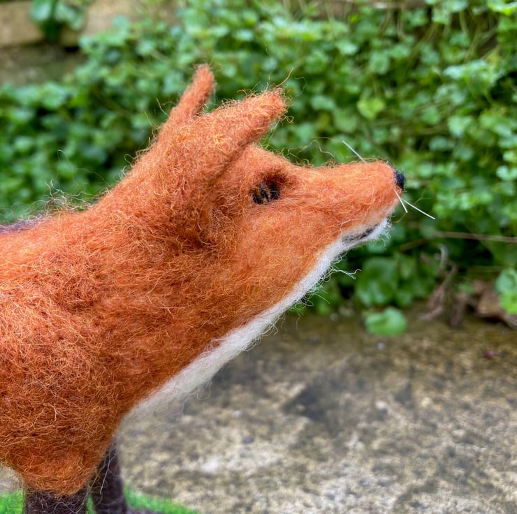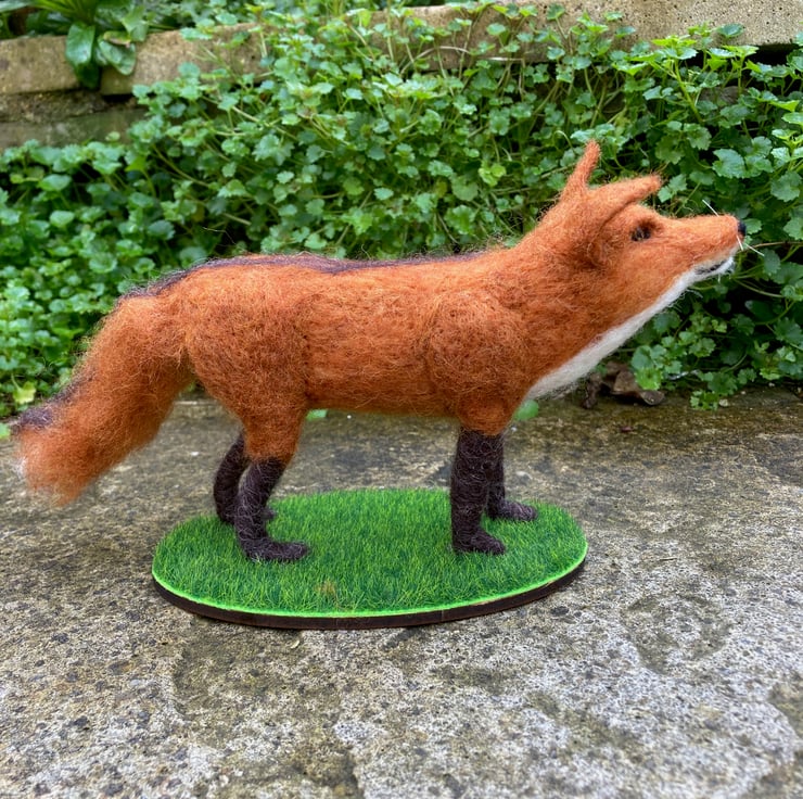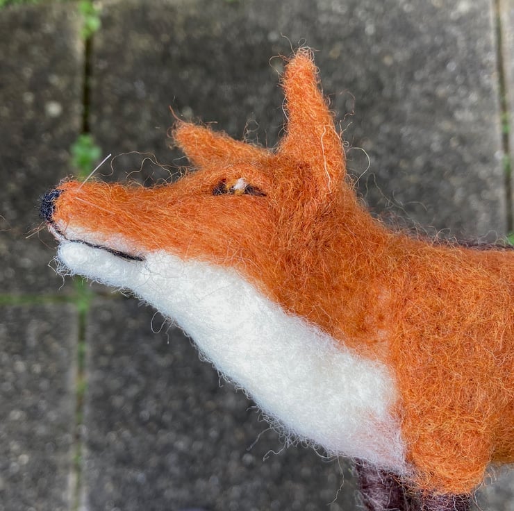 This sculpture of a fox has been made from woollen fibres using a needle felting technique. A core of white woollen fibres has been used to form the basic shape which has then been covered ('painted') with fox red fibres with darker fibres used for the legs and to add highlights to the tail and back.