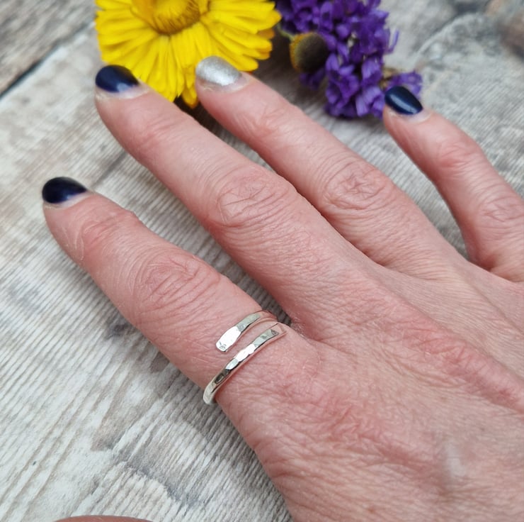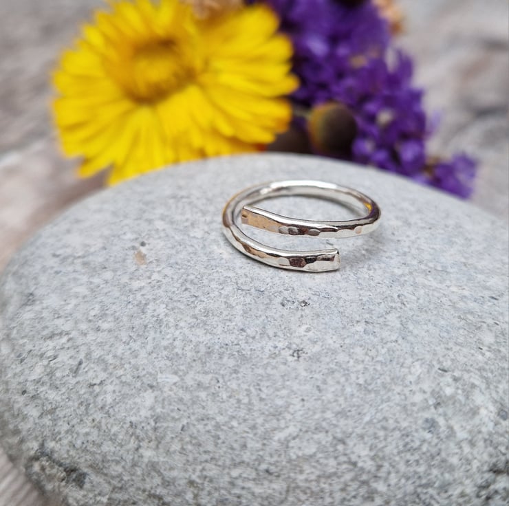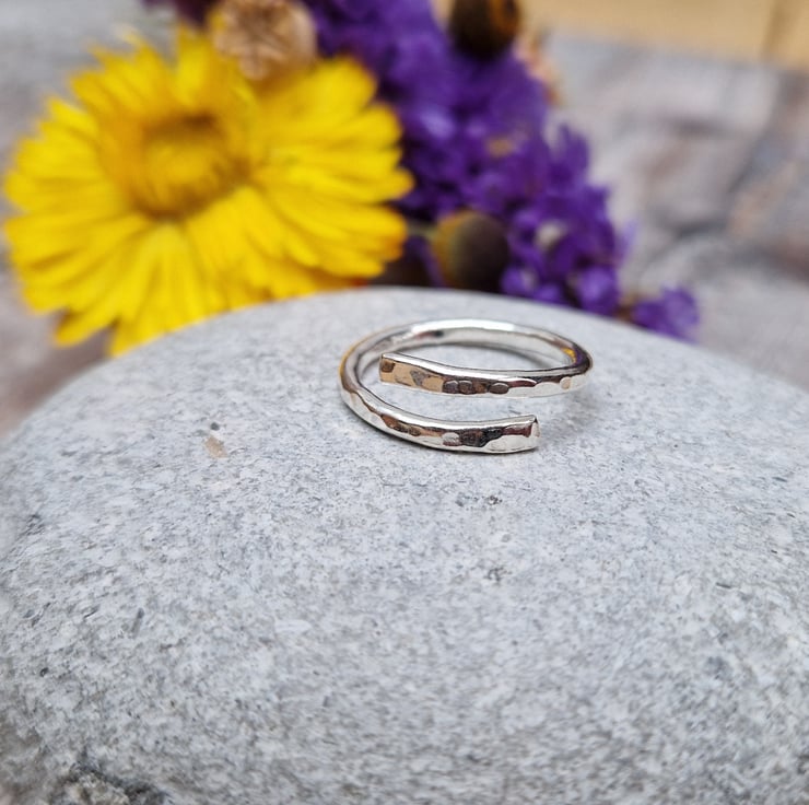 This handmade sterling silver wrap ring features a beautifully hammered finish, giving it a subtle texture that catches the light with every movement. The delicate wrap-around design offers a comfortable, adjustable fit, while the hammered surface adds a touch of individuality to its minimalist form.