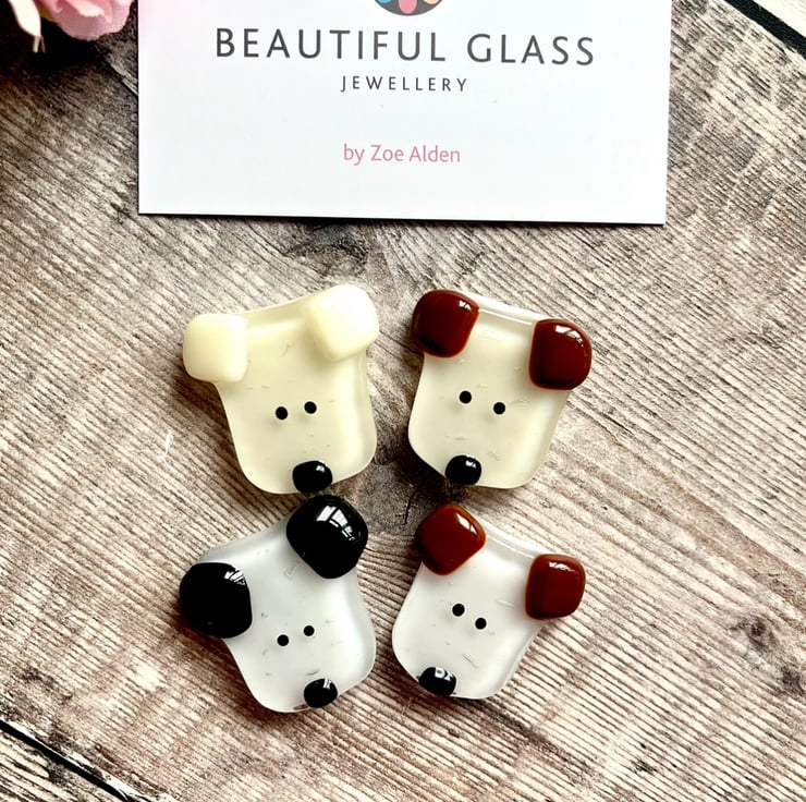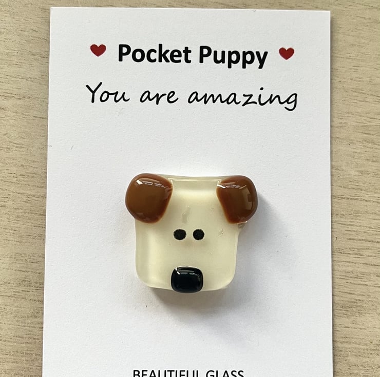 I have individually made each puppy by cutting tiny pieces of glass and fusing them together in my kiln, so each one is unique and may differ slightly from the photo. It has been glued onto a piece of white card with a choice of one of the messages from the drop-down menu. (The message on the first photo is one of the choices, it is NOT shown on each card)