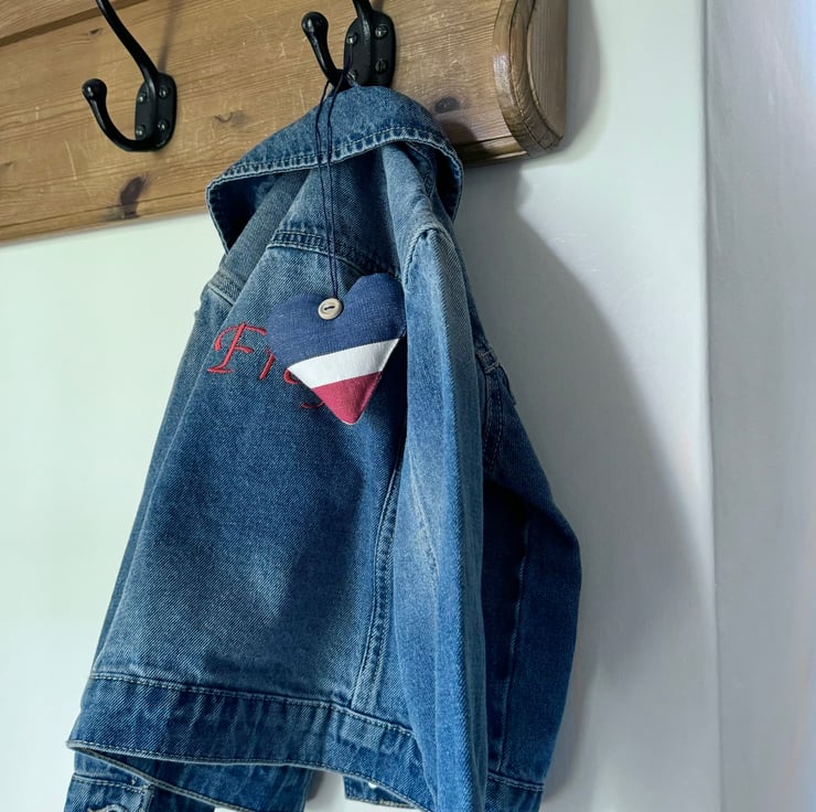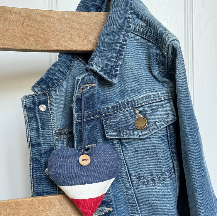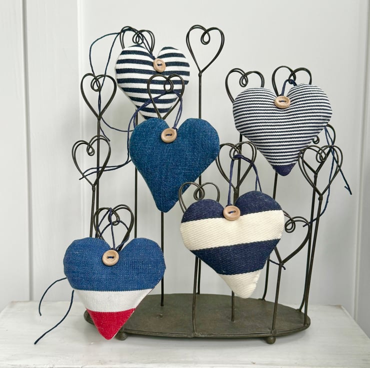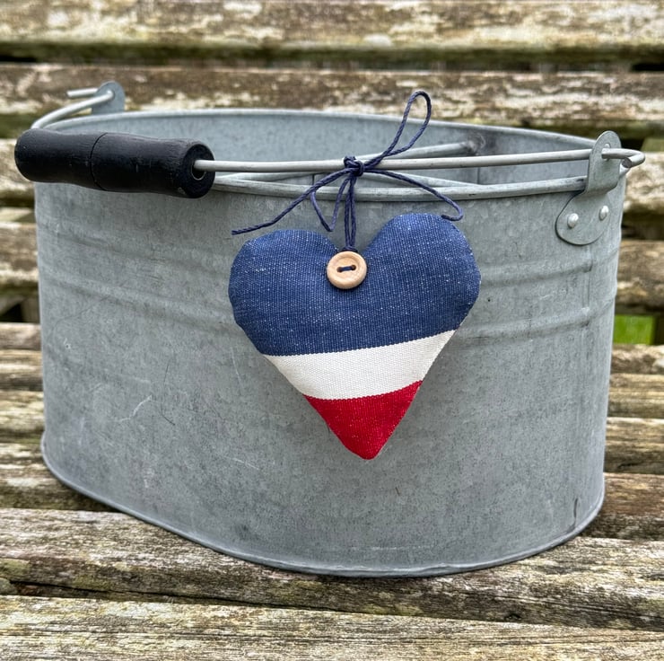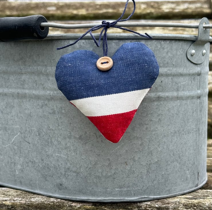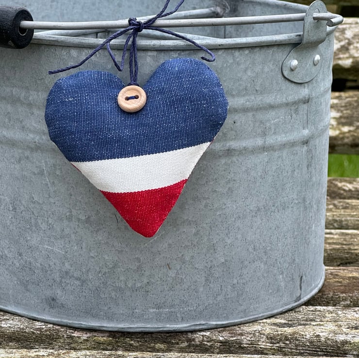 Navy blue, white and red stripes, filled with super fragrant Hampshire lavender and hand finished with a round wooden button and dark blue hemp twine hanging ties.
