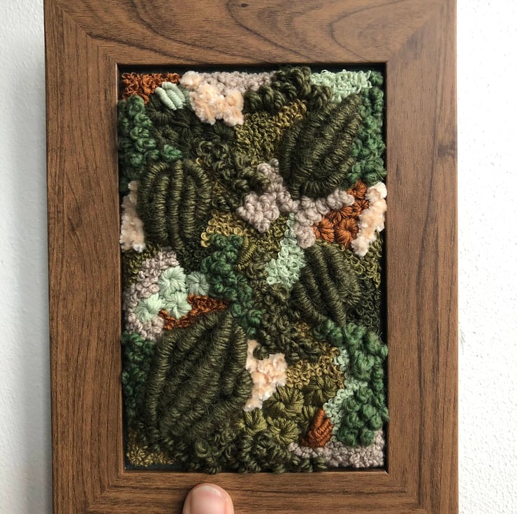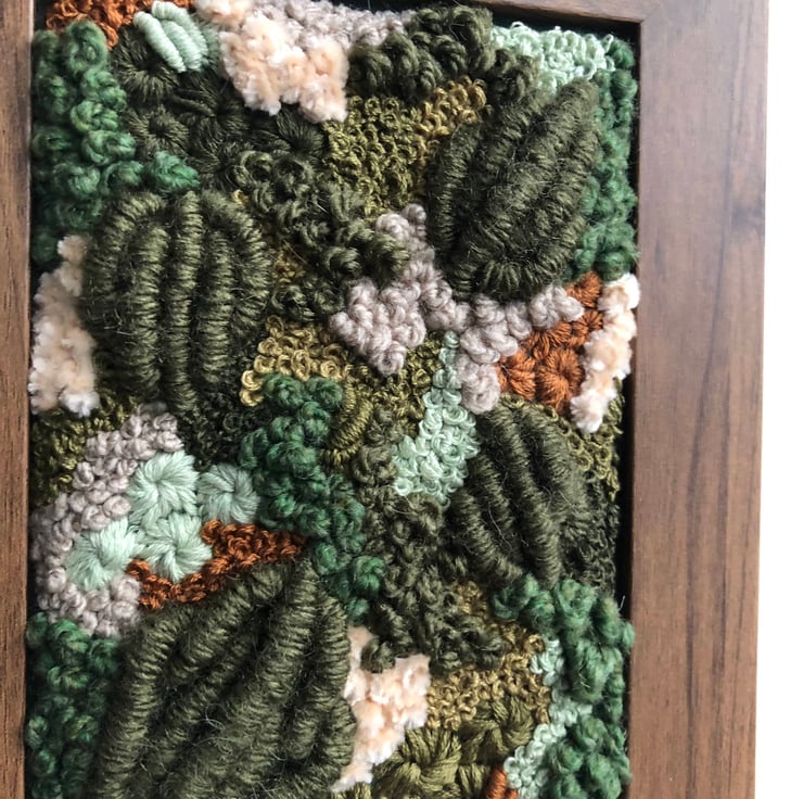 Woodland frolicks a hand embroidered one of a kind home decor art piece which has been placed in a 8 by 5.5 inch dark wood look frame. This piece is eye catching and unique a perfect addition to any home