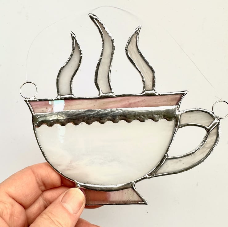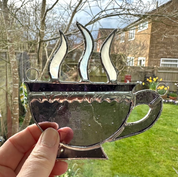 Each piece of glass has been cut by hand, ground to remove any sharp edges, wash, fold and soldered together and then washed again. I have used scalloped copper foil on the teacup lip to add a decorative feature. Two rings and a length of fishing line have been attached for hanging purposes.