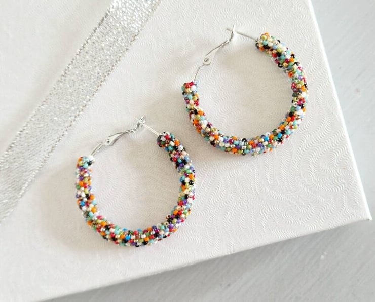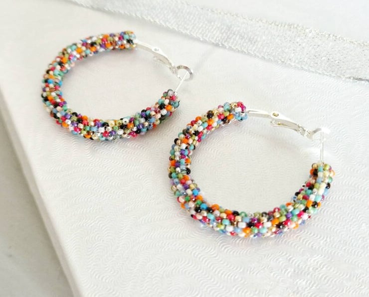 Add some fun to your look with our cheerful Rainbow Hoop Earrings. Hand-woven using the highest quality Miyuki glass beads, these elaborate silver hoops marry a spectrum of shades that's fun, funky and bang on trend.