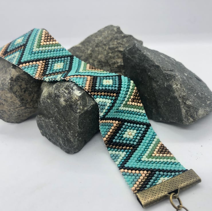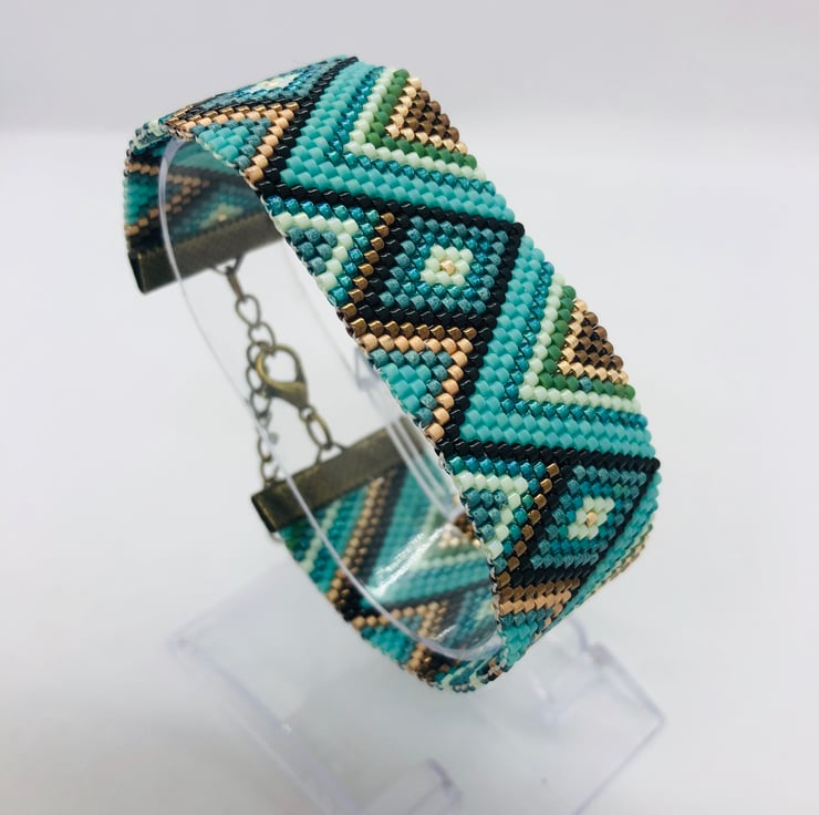 This delicate yet striking bracelet looks stunning and unusual - it always gets admiring comments! Made from over 1500 tiny beads, this bracelet is painstakingly hand stitched together using a super strong thread and is fitted with antique bronze effect clasps with an extender chain to allow fit to a range of sizes.