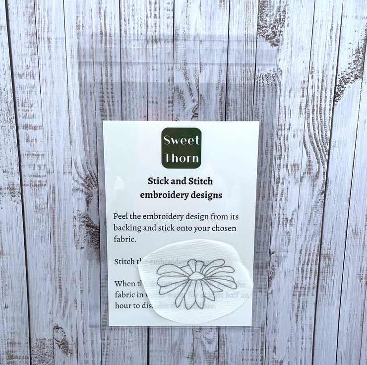 A pretty meadow daisy flower on a wash away embroidery sticker. Perfect for adding a bit of wildflower flair to clothes or accessories.