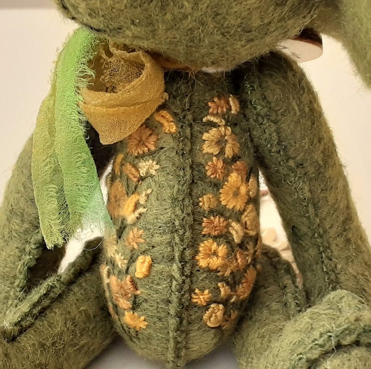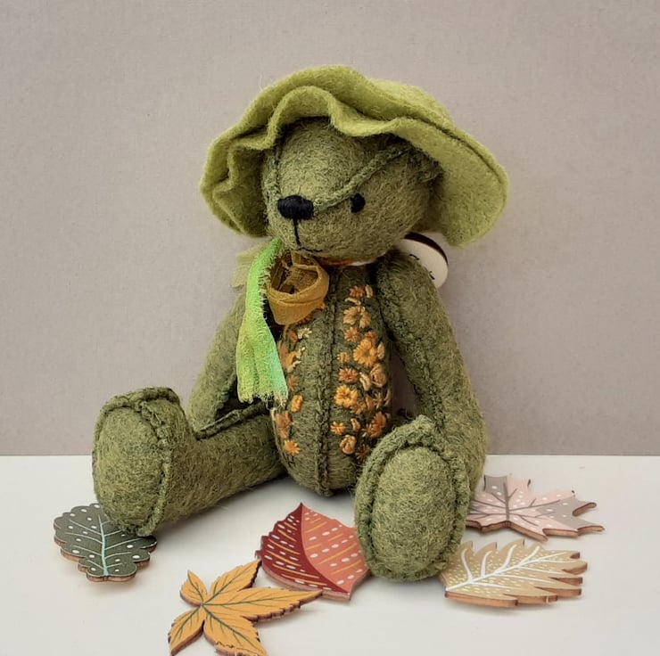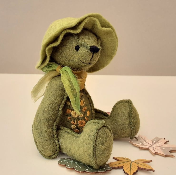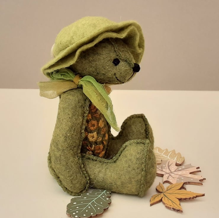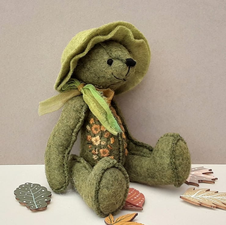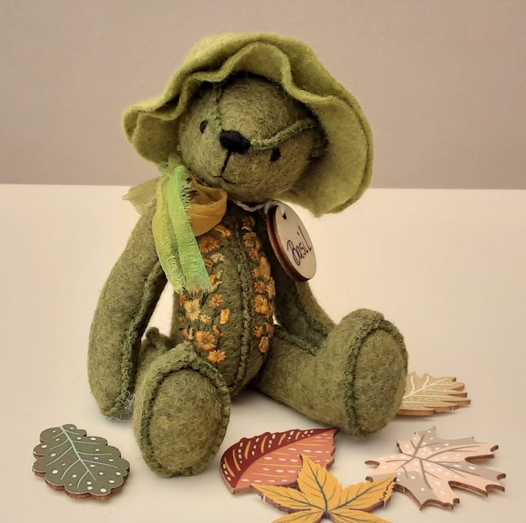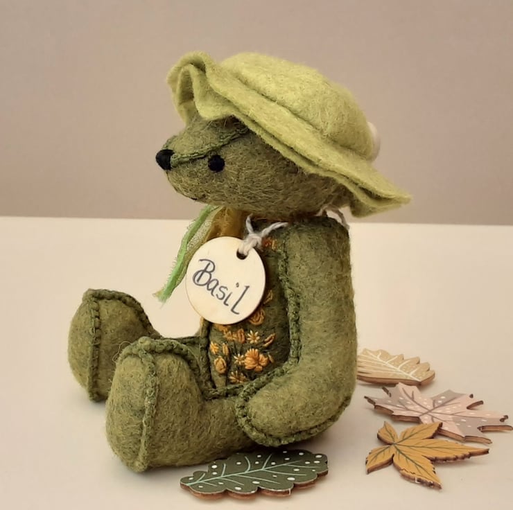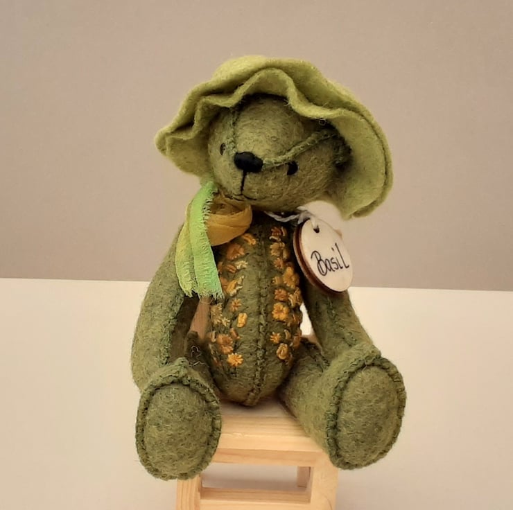Meet Basil, a unique one off bear in a new design standing at approx 6", 15cm tall and completely hand sewn from quality blended wool felt (80/20) in a mottled kiwi green.