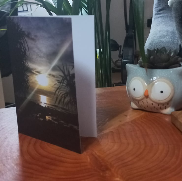 Sun and sky are framed by two palm trees on this Island in Thailand. Creating silhouettes together with the calming reflection in the water and shining light of the sun coming through, it would make a lovely card for any occasion.