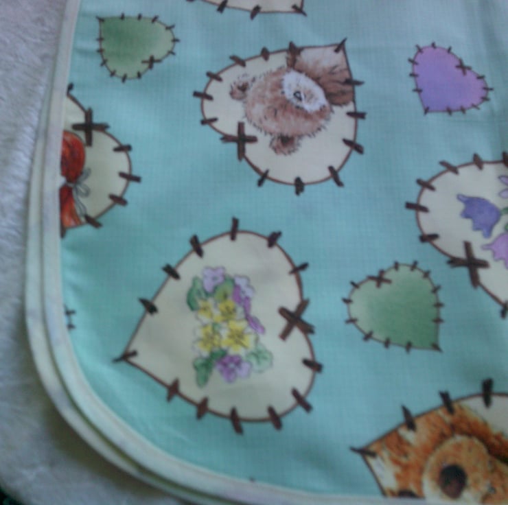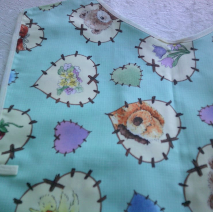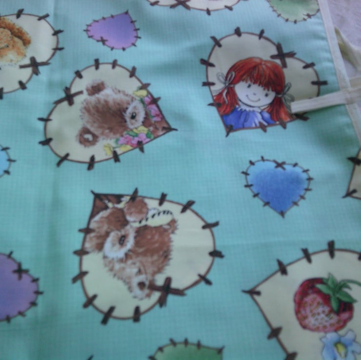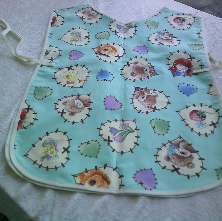 This child's tabard is made using 100% cotton fabric and has a design of cream patchwork hearts with teddy bears and flowers along with pink, blue and green patchwork hearts on a turquoise background. It is edged with cream bias binding. There is a pocket on the front and ties on the sides
