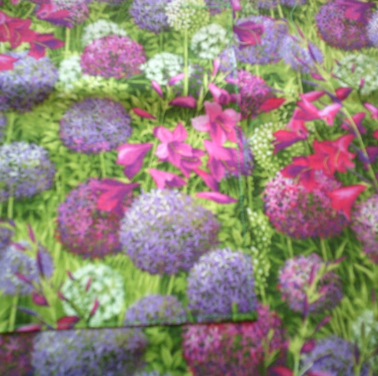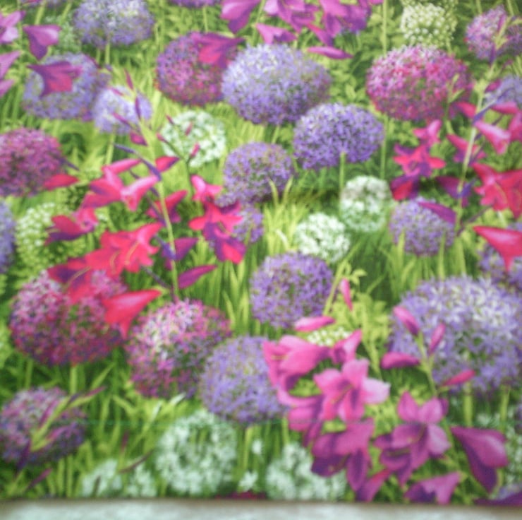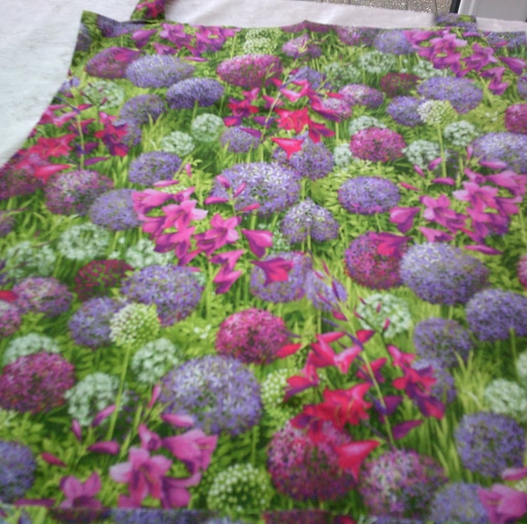 The design of the fabric used for this apron is and all over design of Gladioli and Alliums.