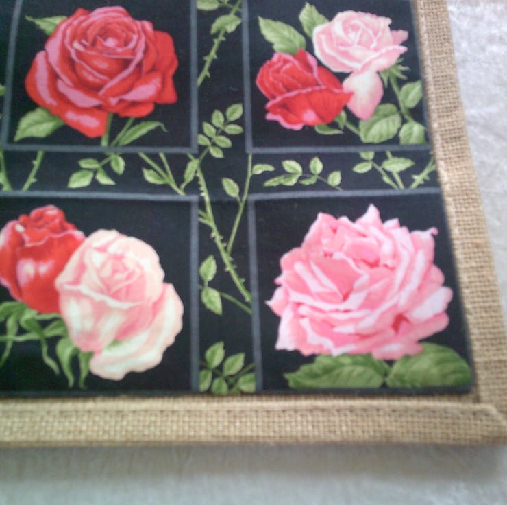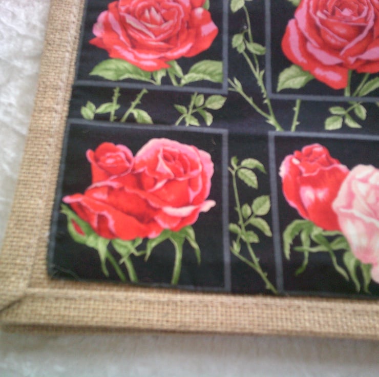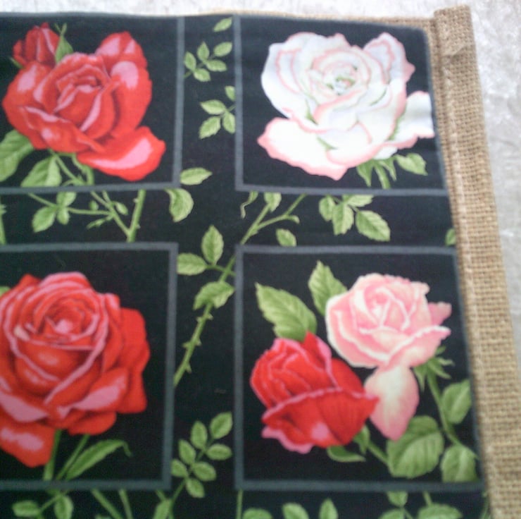 The bag itself measures approximately 30 x 30 x 20 cm (12 x 12 x 8 inches). The fabric pocket - which has been hand sewn onto the bag is a panel featuring 9 different pictures of roses on a black background.