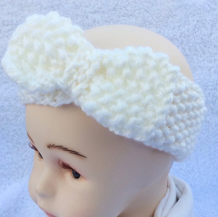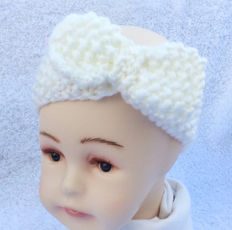 Cute little headband designed and hand knitted by me in my Suffolk home. I have used a very soft merino wool and acrylic mix yarn in a lovely neutral cream shade. Would make a very welcome gift for a new baby. Will fit from birth up to about six months.