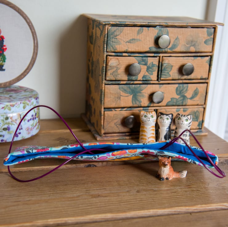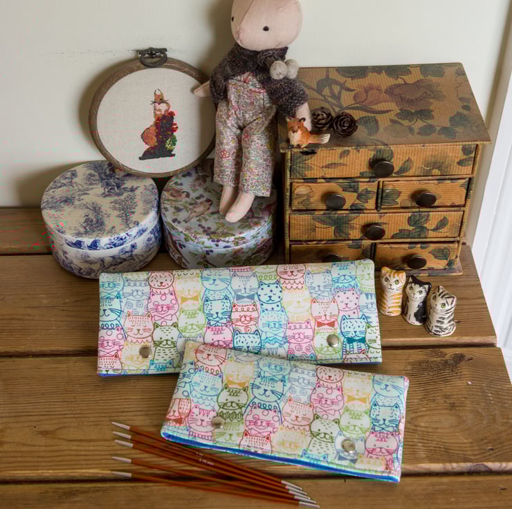 Made with a very cute and colourful print featuring lots of cat portraits by Makower, this holder is lined with a coordinating bright turquoise cotton inside. The outer is interfaced with woven cotton and there's also a layer of fleece to give a little protection to your needles.