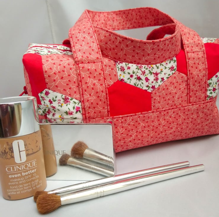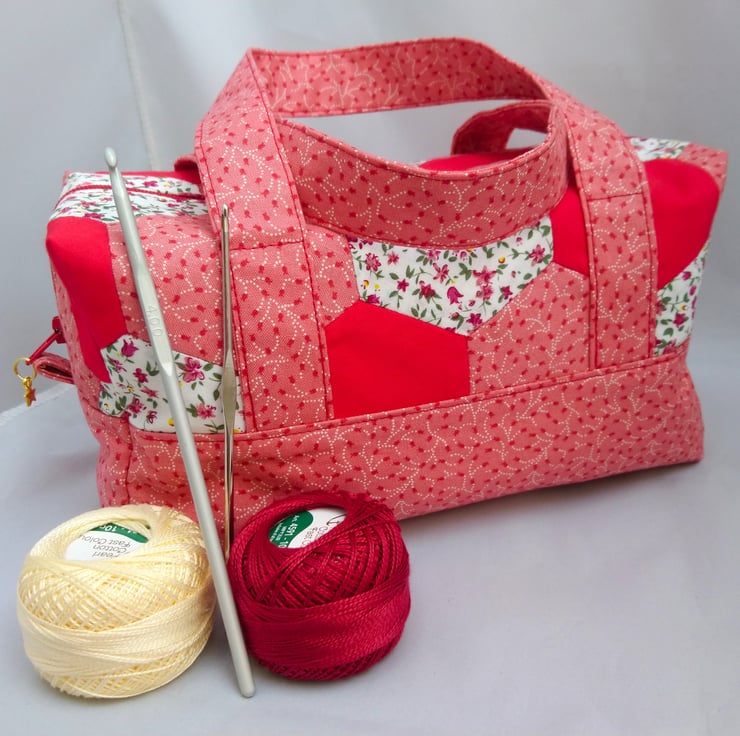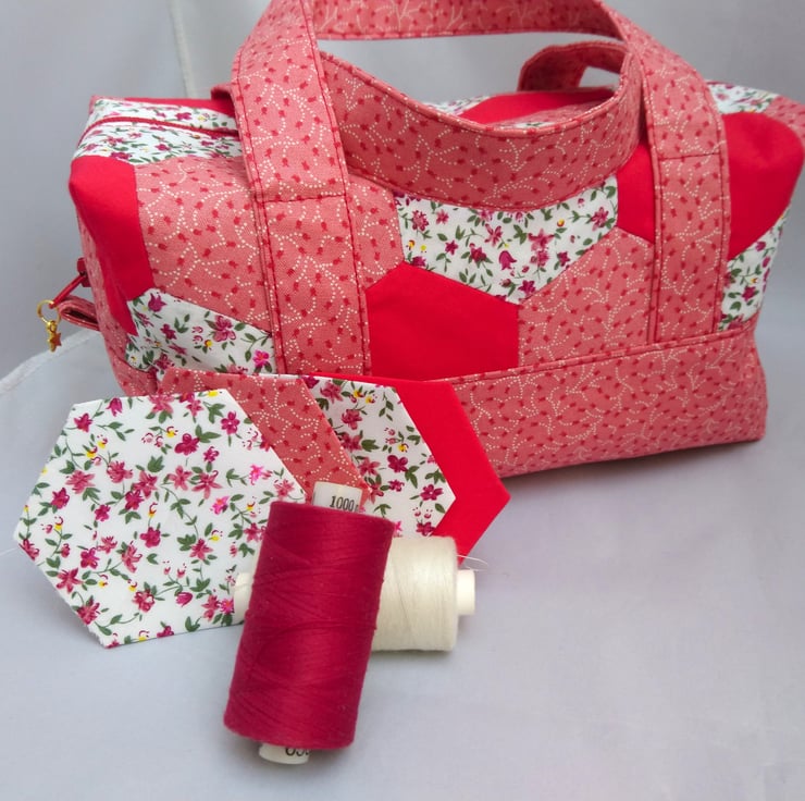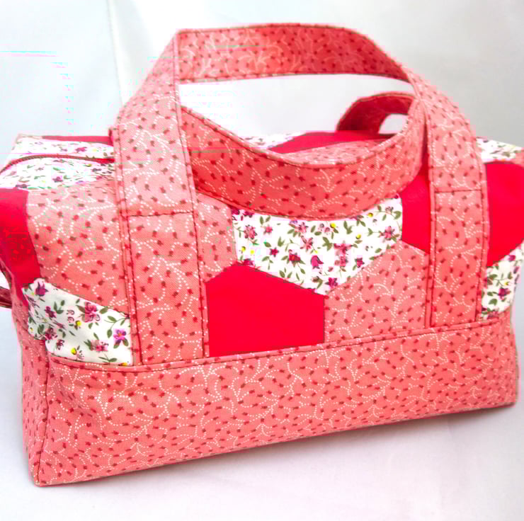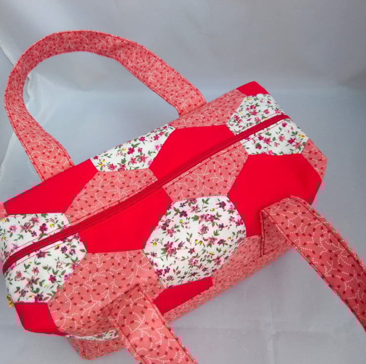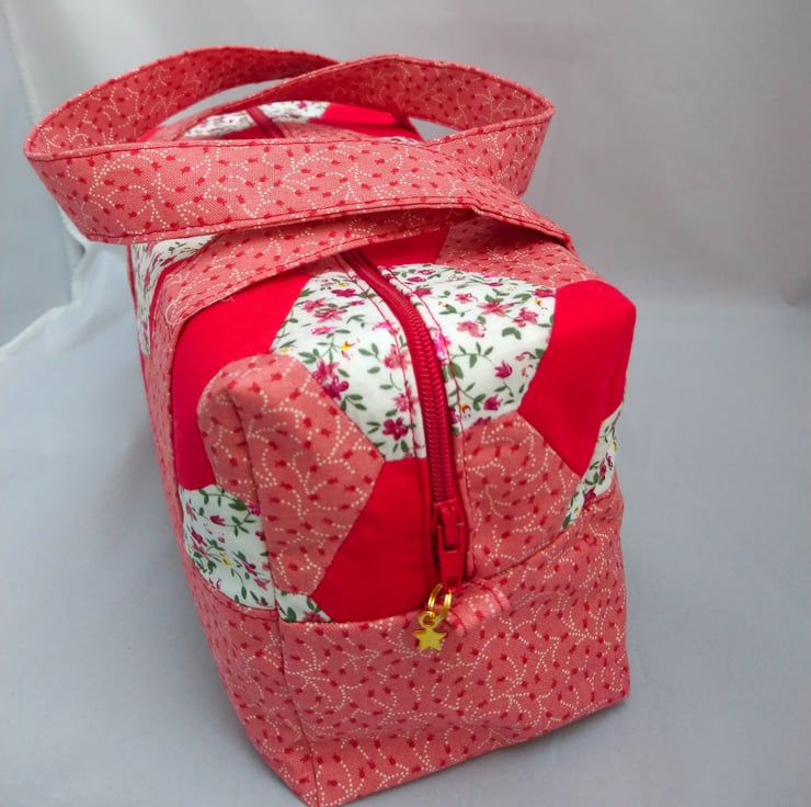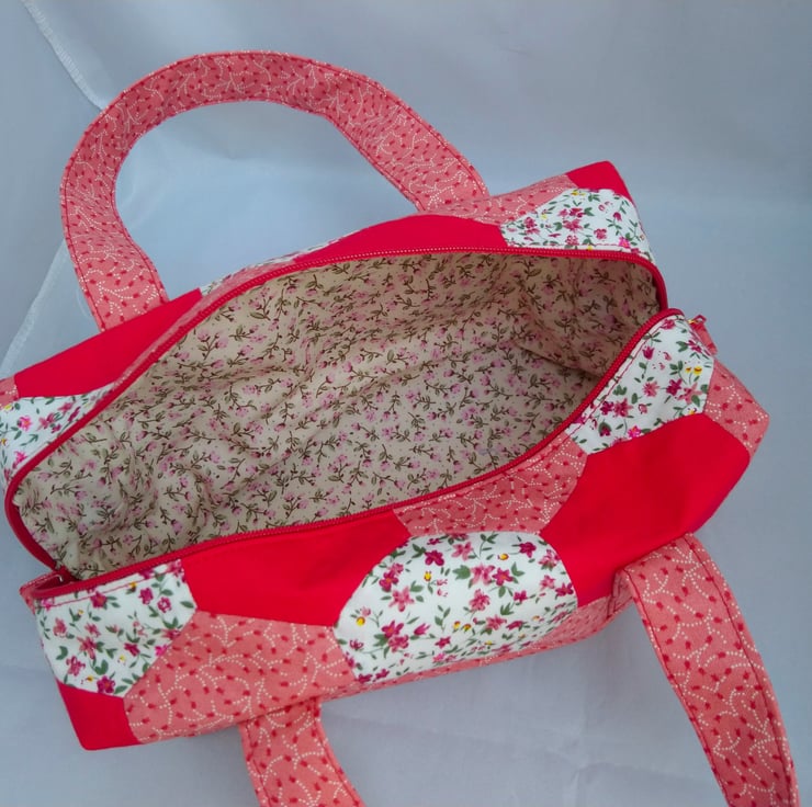 Hexagon Handled Zipped Box Shape Bag in colourways of red, white, pinks and flowers. The top hexagon fabric has been hand made. Lovely spring/summer colours.. Multi use Option. This Bag is made of 100% cotton fabric inside and outside. It has interfacing between the layers for support. Floral lining