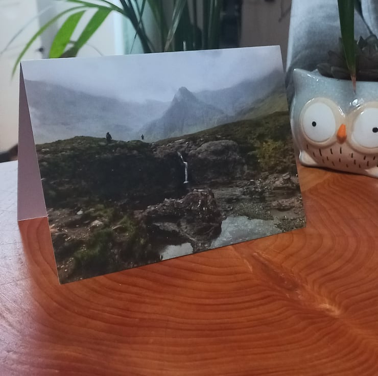 Original image view of a wild and misty day on the Isle of Skye. A small waterfall gushes into the rock pool as hikers head on towards the mountains in the distance.