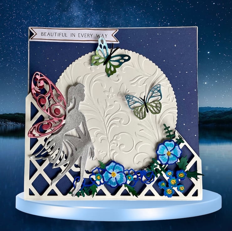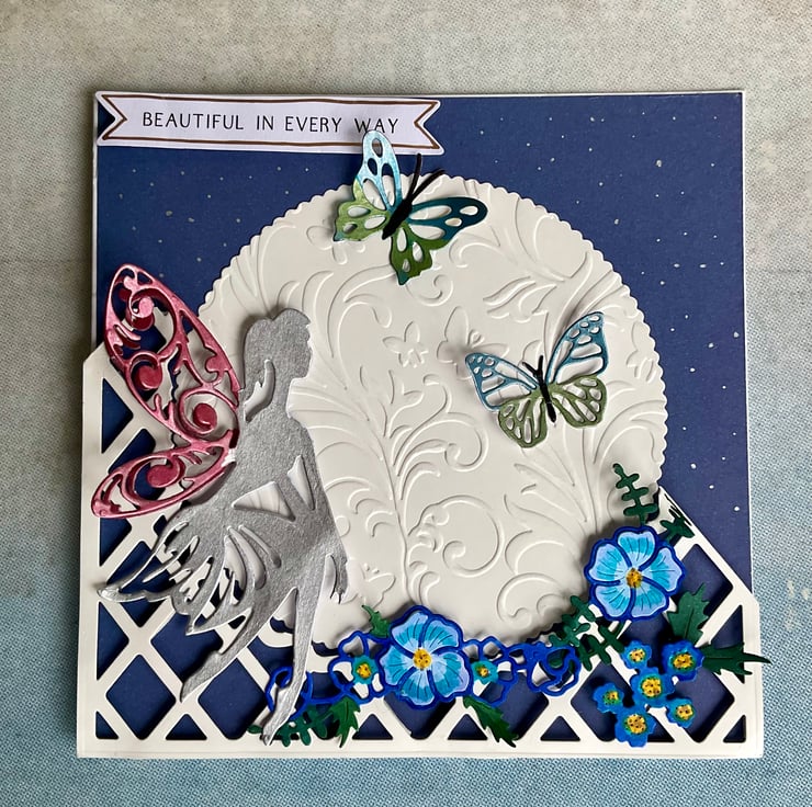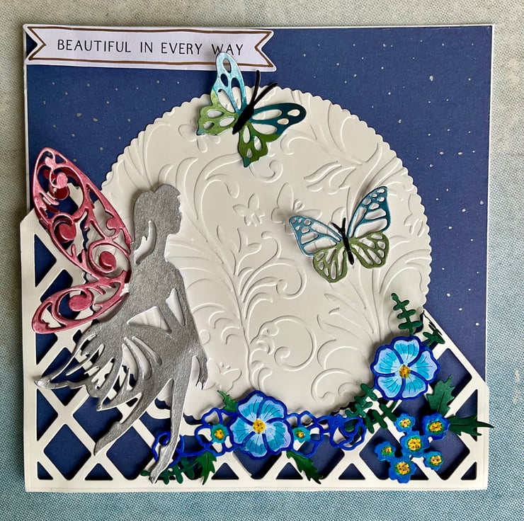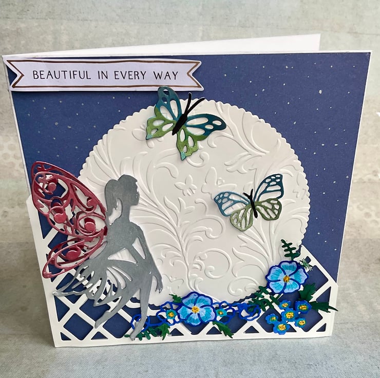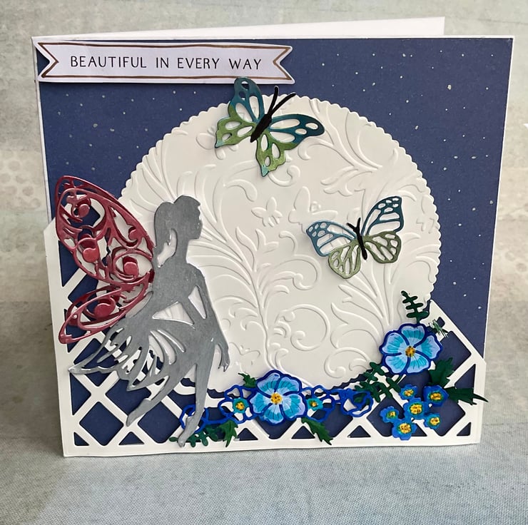 The card has navy blue paper background on a white hammered card base. This has been decorated with a metallic painted fairy sitting on a trellis decorated with die cut hand painted flowers.