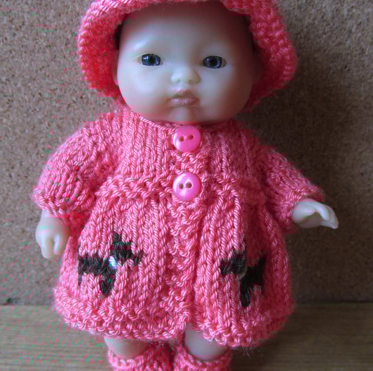Really cute hand made dolls outfit for a 5 inch Berenguer Baby, comprising coat with dog motifs knitted into the front and back, matching hat, pants and shoes. You are buying the outfit only, the doll is not included.