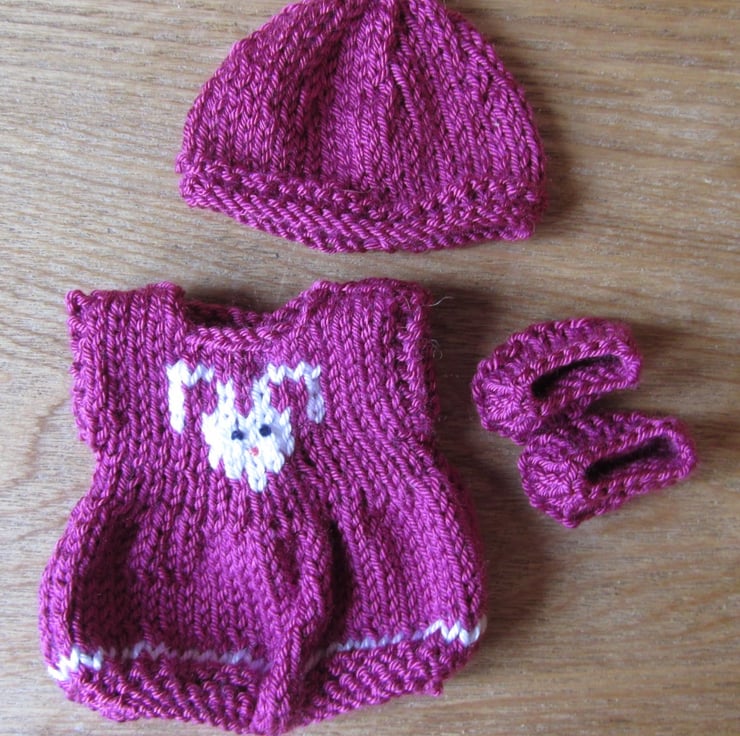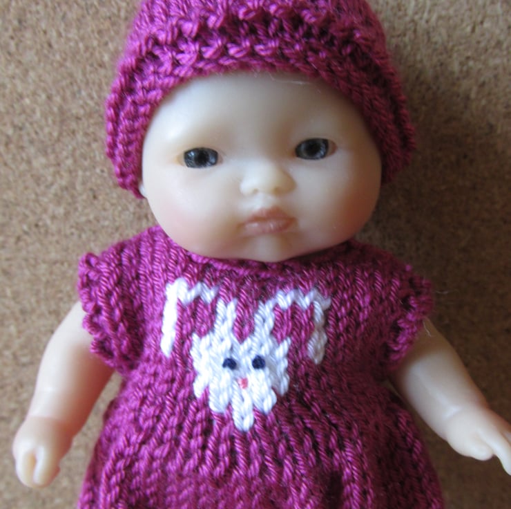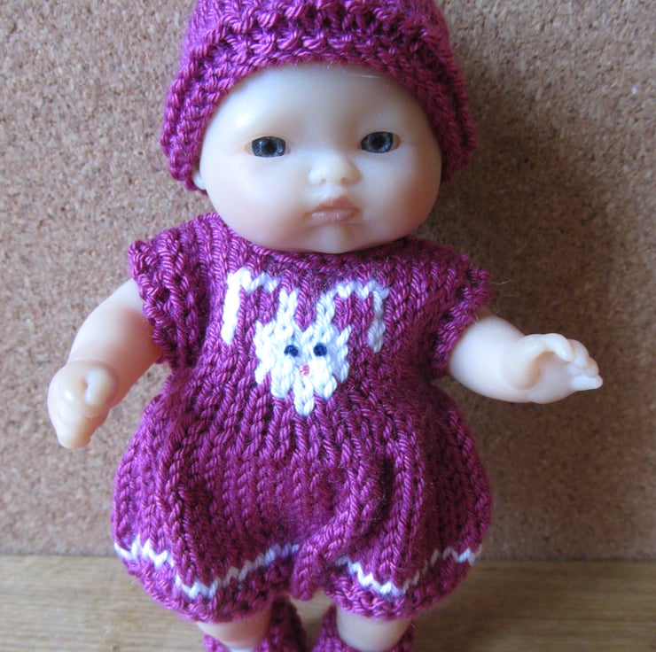 Cute hand made outfit for a five inch doll comprising romper suit with rabbit motif knitted into the front and fastening with 2 buttons at the back, matching shoes and hat. You are buying the outfit only, the doll is not included.