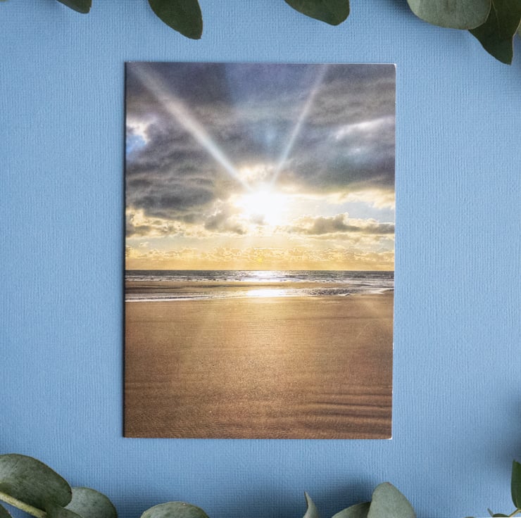 Sunrays beaming through the sun-lit clouds and glistening over the sea on this Welsh beach. Ripples in the sand are shown as the light makes its way across the beach.