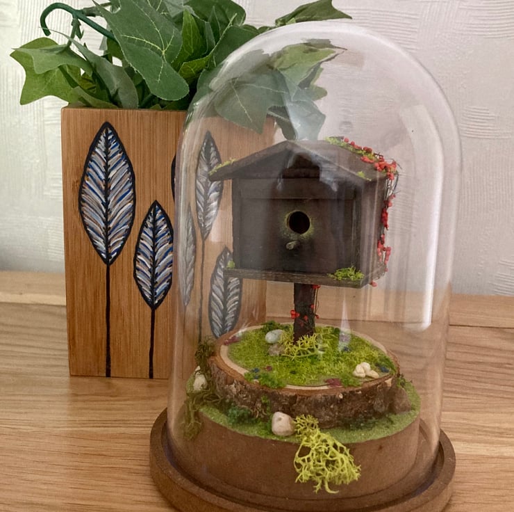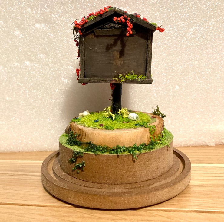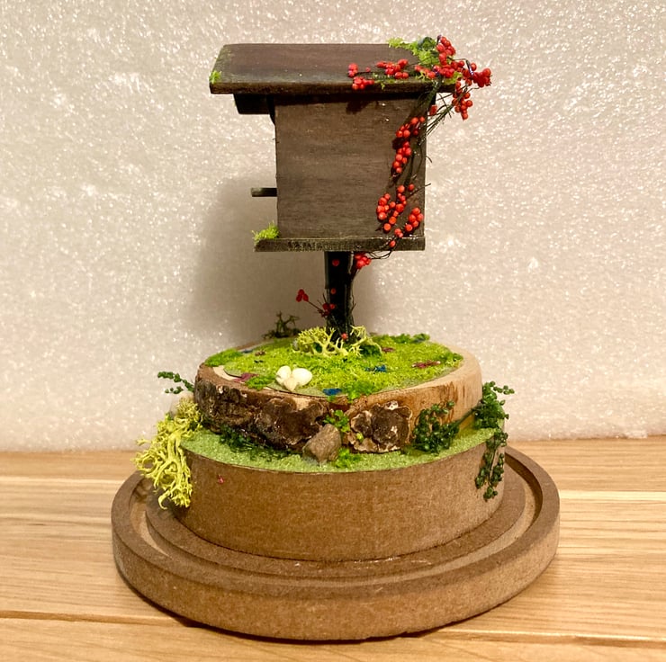 Here is a lovely little bird house diorama that has been hand built using plywood and dried flowers.