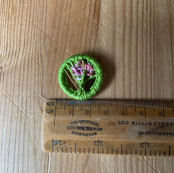 It features a brass ring covered with buttonhole stitches worked in a grass green cotton thread which has also been used to form the stalks of the posy. A spray of blossom is depicted with embroidered French knots in shades of pink.