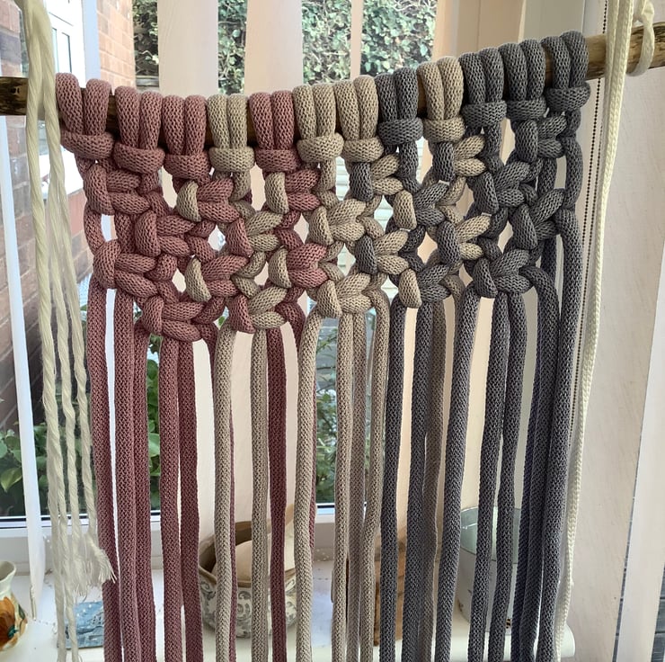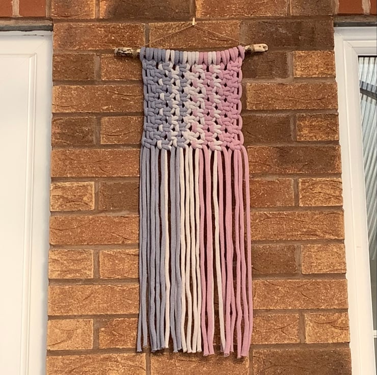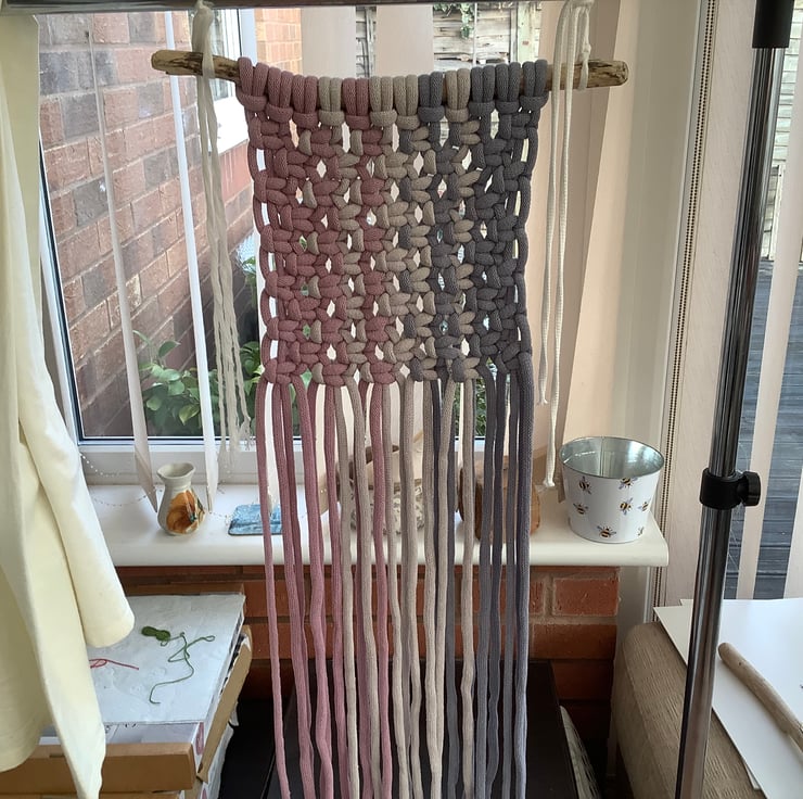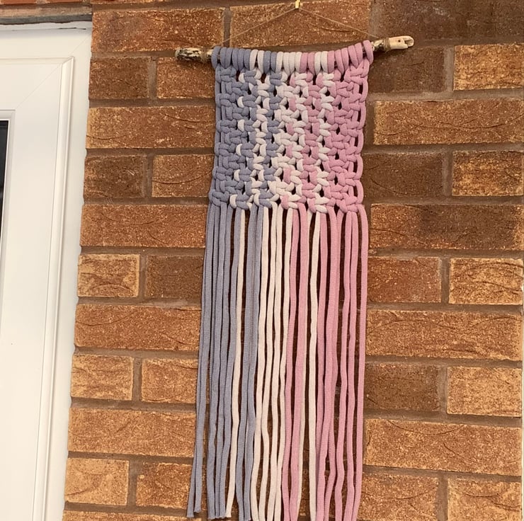 I have made this lovely wall hanging using a 9mm jumbo cord made from Bobbiny recycled cotton in 3 different shades lavender/grey/dusty pink, on a piece of washed driftwood from my local beach.