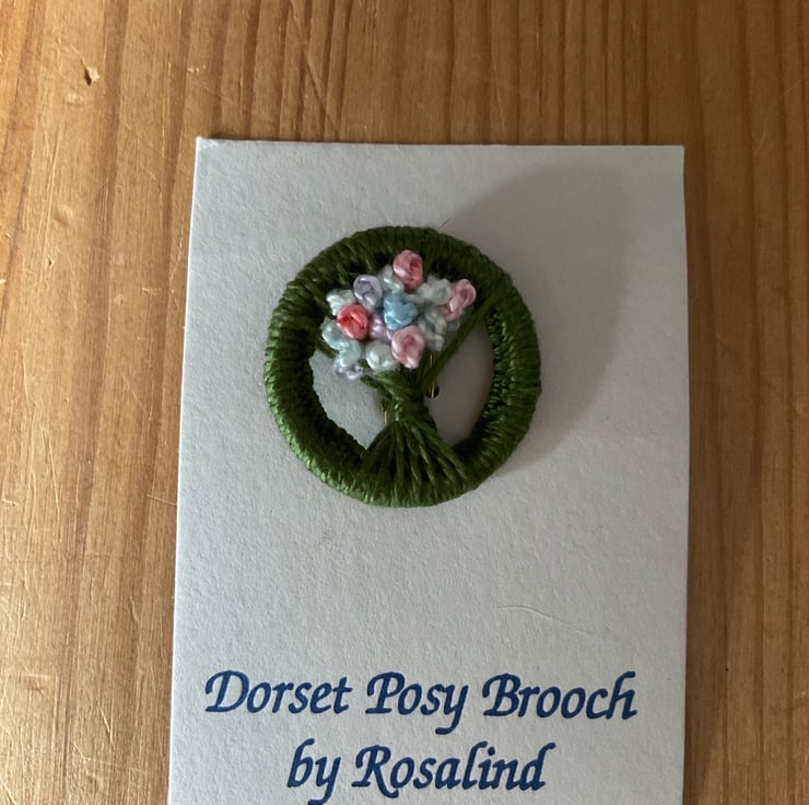 It features a brass ring covered with buttonhole stitches worked in a dark green cotton thread which has also been used to form the stalks of the posy. A spray of blossom is depicted with embroidered French knots in pastel shades of pink and blue.