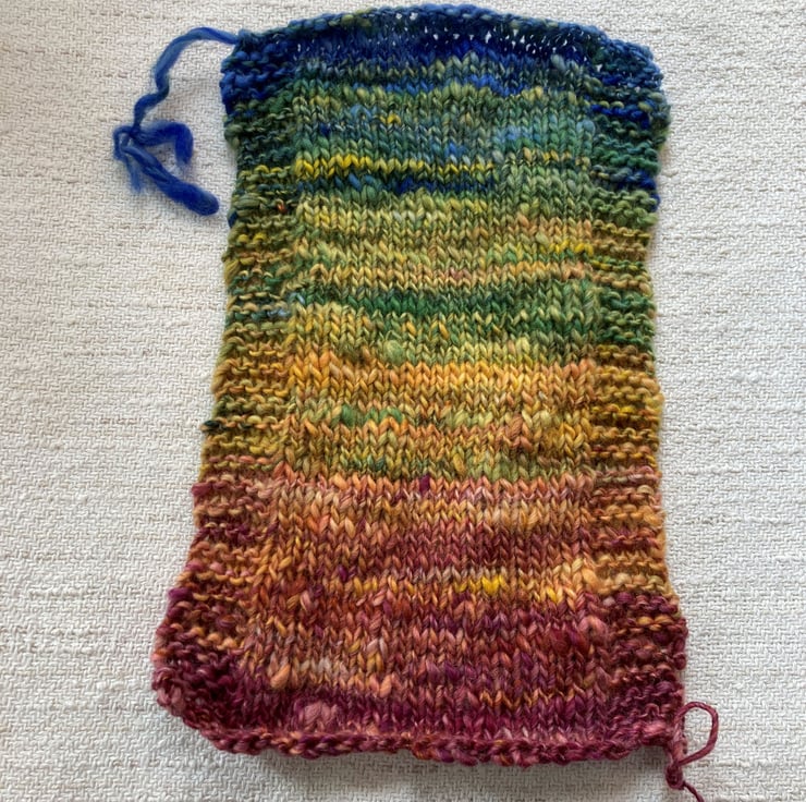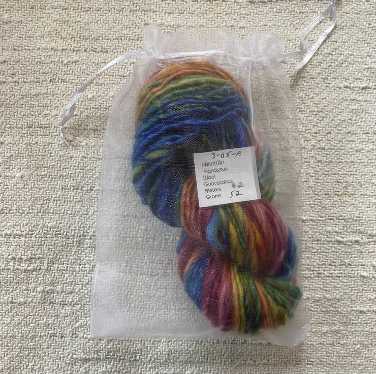 This creates a soft and springy wool yarn that is lovely to knit, crochet or nalbind. The yarn has been spun from a specially carded batt in a rainbow of colours. Each skein is unique. I call my unique blend of coloured yarns Guovsahas - the North Sami word for Northern Lights.