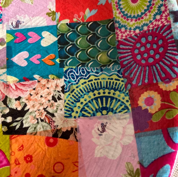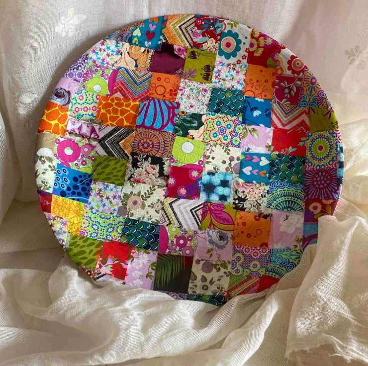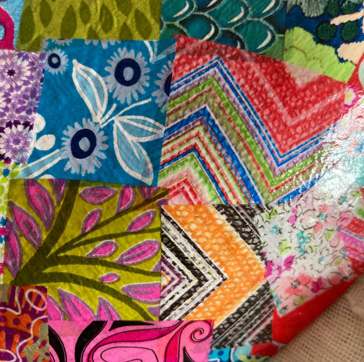 This bamboo plate has been up cycled using decopatch papers which have been patch worked together to make it like new