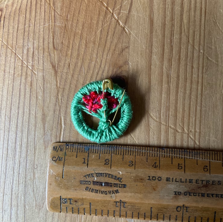 It features a brass ring covered with buttonhole stitches worked in a pale green cotton thread which has also been used to form the stalks of the posy. A spray of blossom is depicted with embroidered French knots in shades of red.