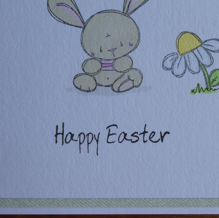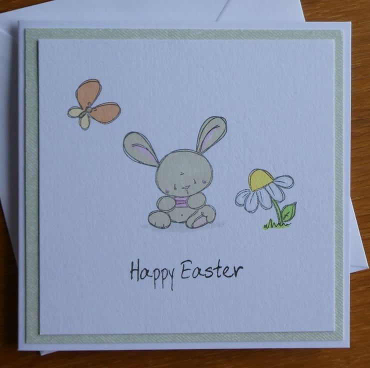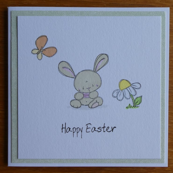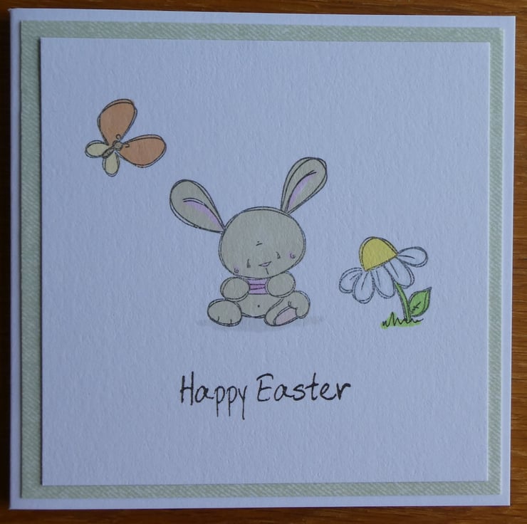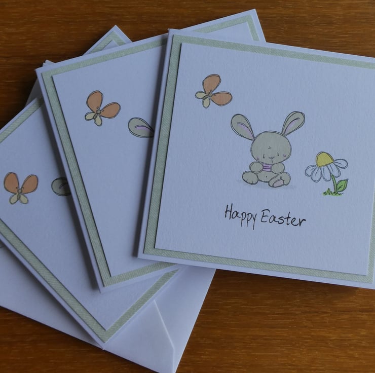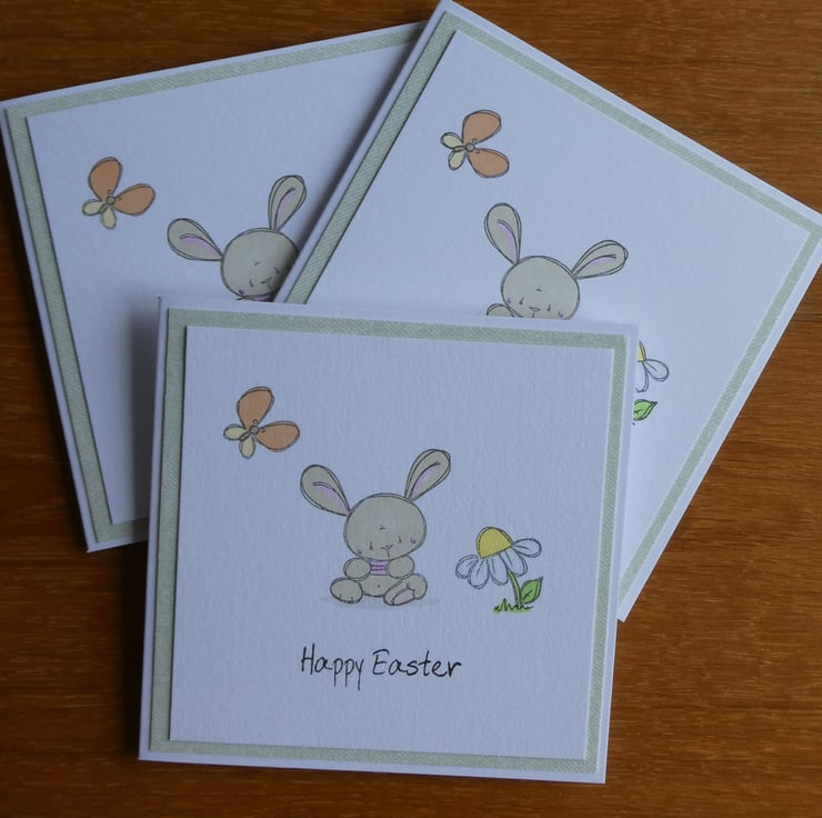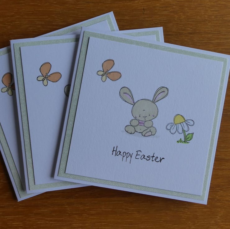 The cards have been handed stamped with images of a cute bunny, a butterfly and a daisy and then hand coloured in pastel shades of beige, pink, yellow and orange using alcohol markers. The message Happy Easter has then been hand stamped in black archival ink.