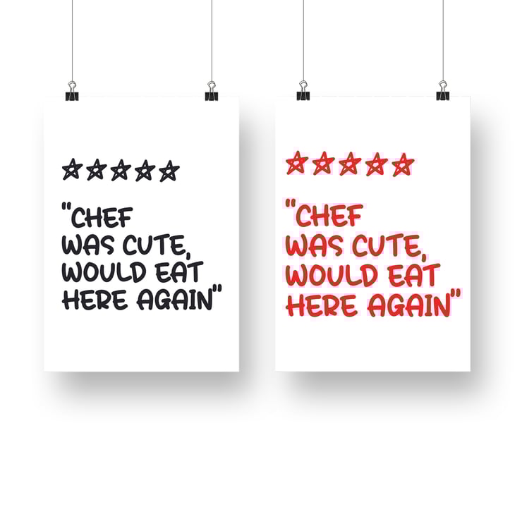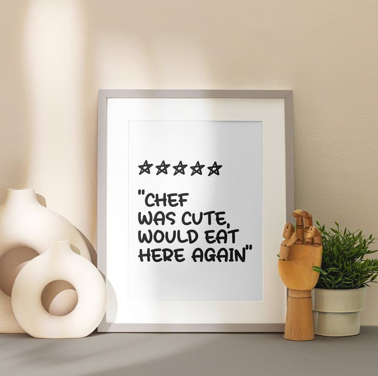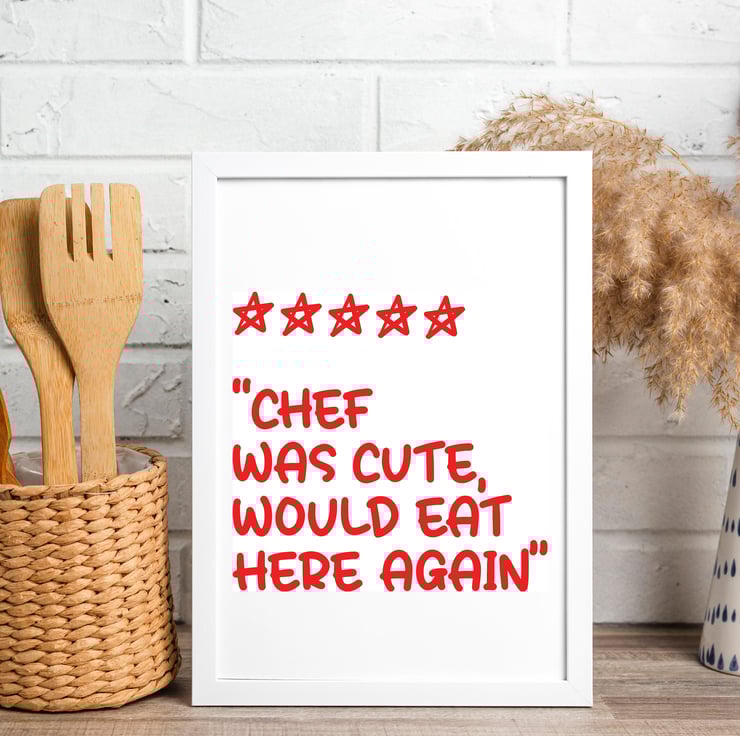 This delightful print is a must-have for any foodie's décor collection. Featuring the quote "Chef is cute, would eat here again", it's sure to bring a smile to your face every time you enter your kitchen.